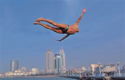 栈桥回澜阁一直是跳水爱好者施展身手的舞台。赵健鹏 摄