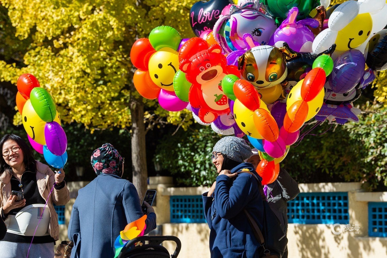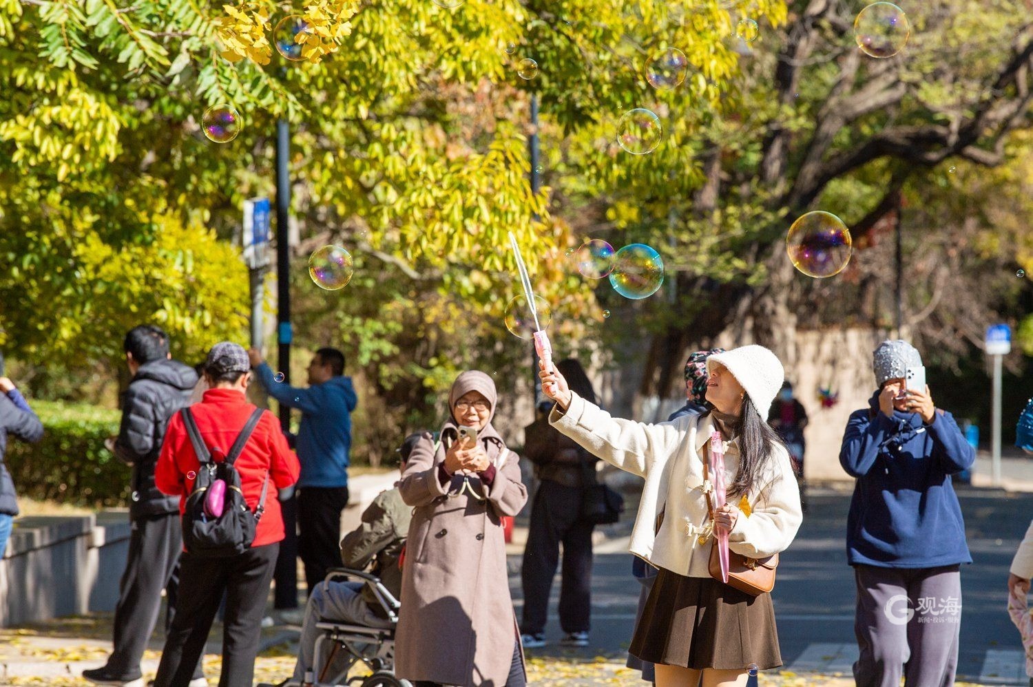 - 不少游客在银杏树下拍照留念。