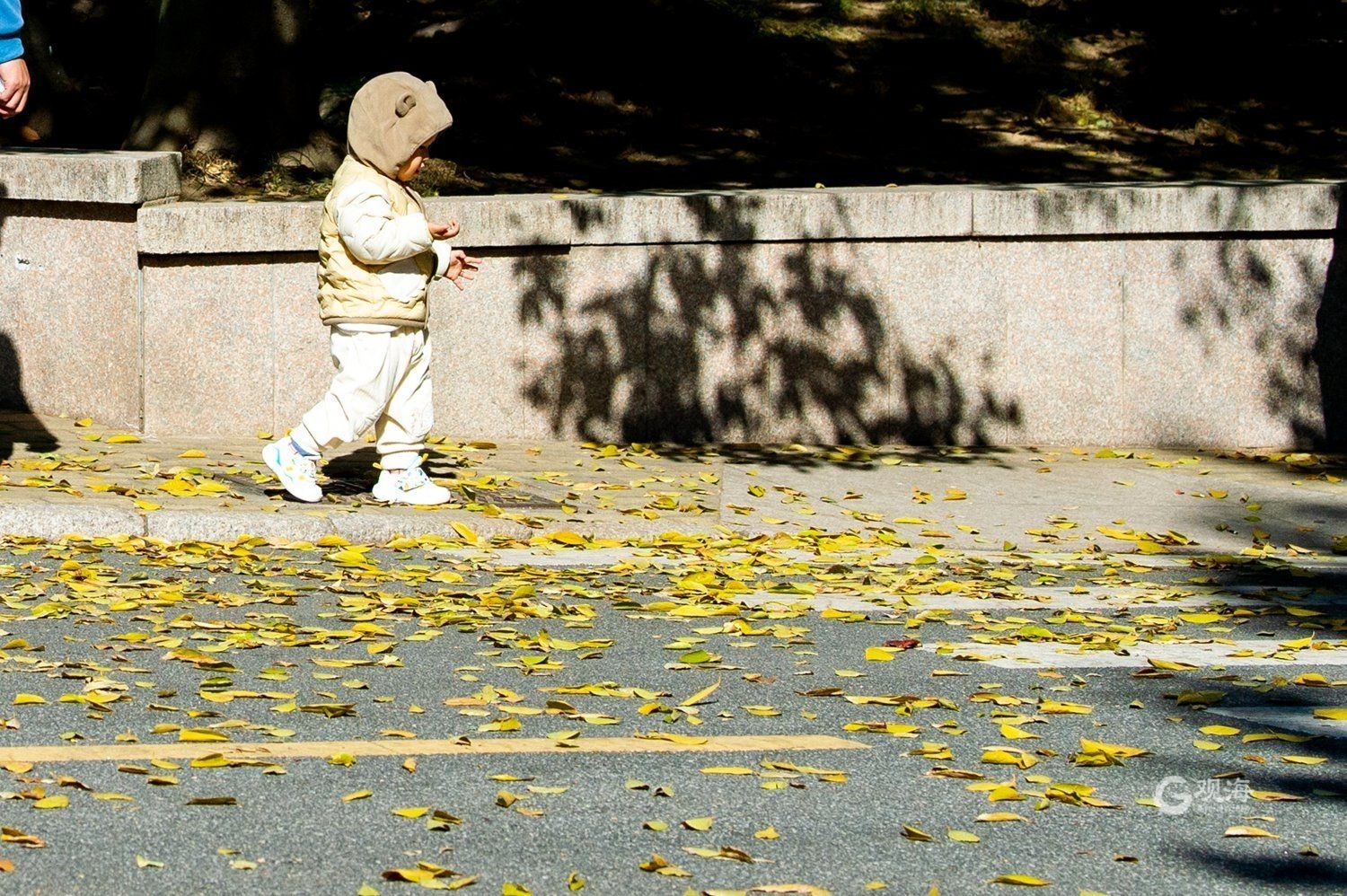 - 落叶飘零,金黄一片,给人一种温暖而浪漫的感觉。