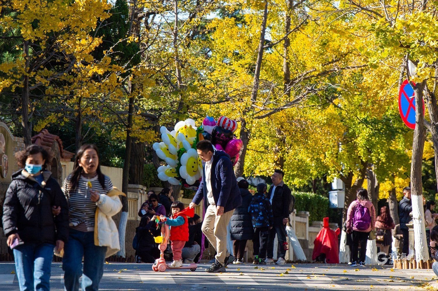 - 游客在居庸关路上欣赏银杏叶。