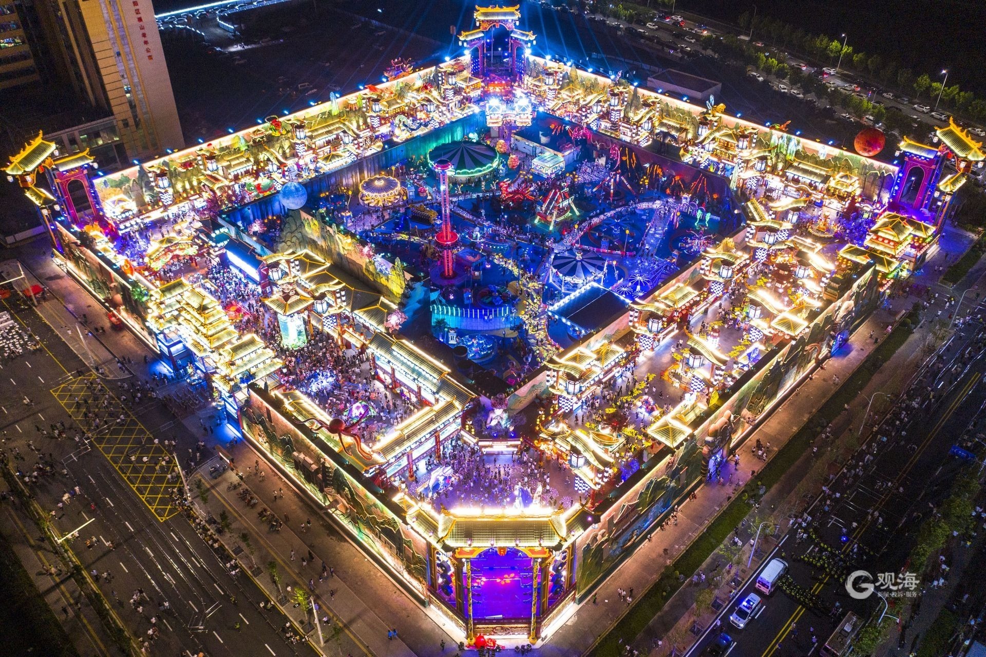 - 6月30日,城阳区的明月·山海间不夜城正式开城。以《山海经》为主题的不夜城从空中俯瞰,就像一个发光的魔方。