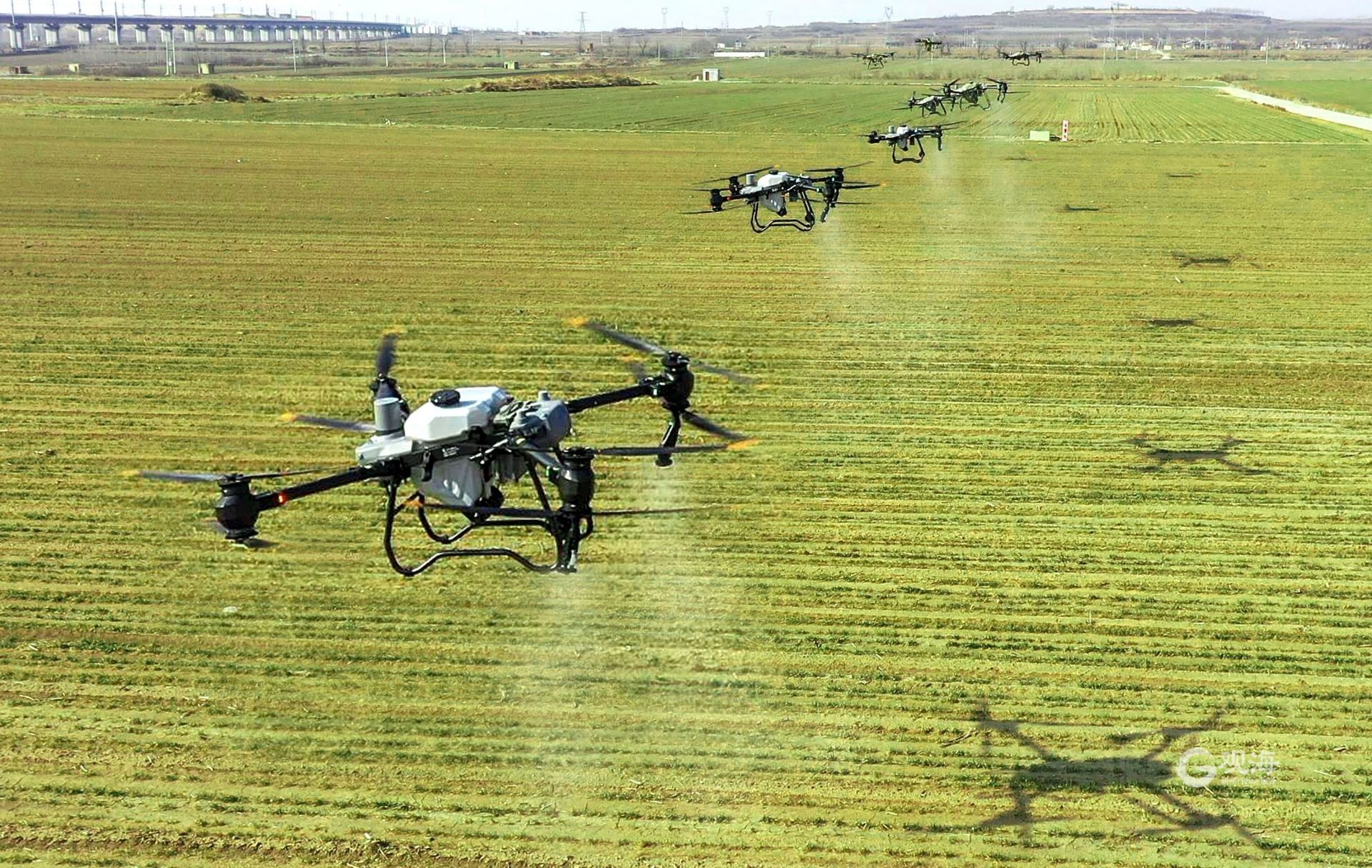- 2月8日,平度市田庄镇西寨村,数架植保无人机在农田上空喷药施肥,春耕作业在新技术加持下拉开序幕。