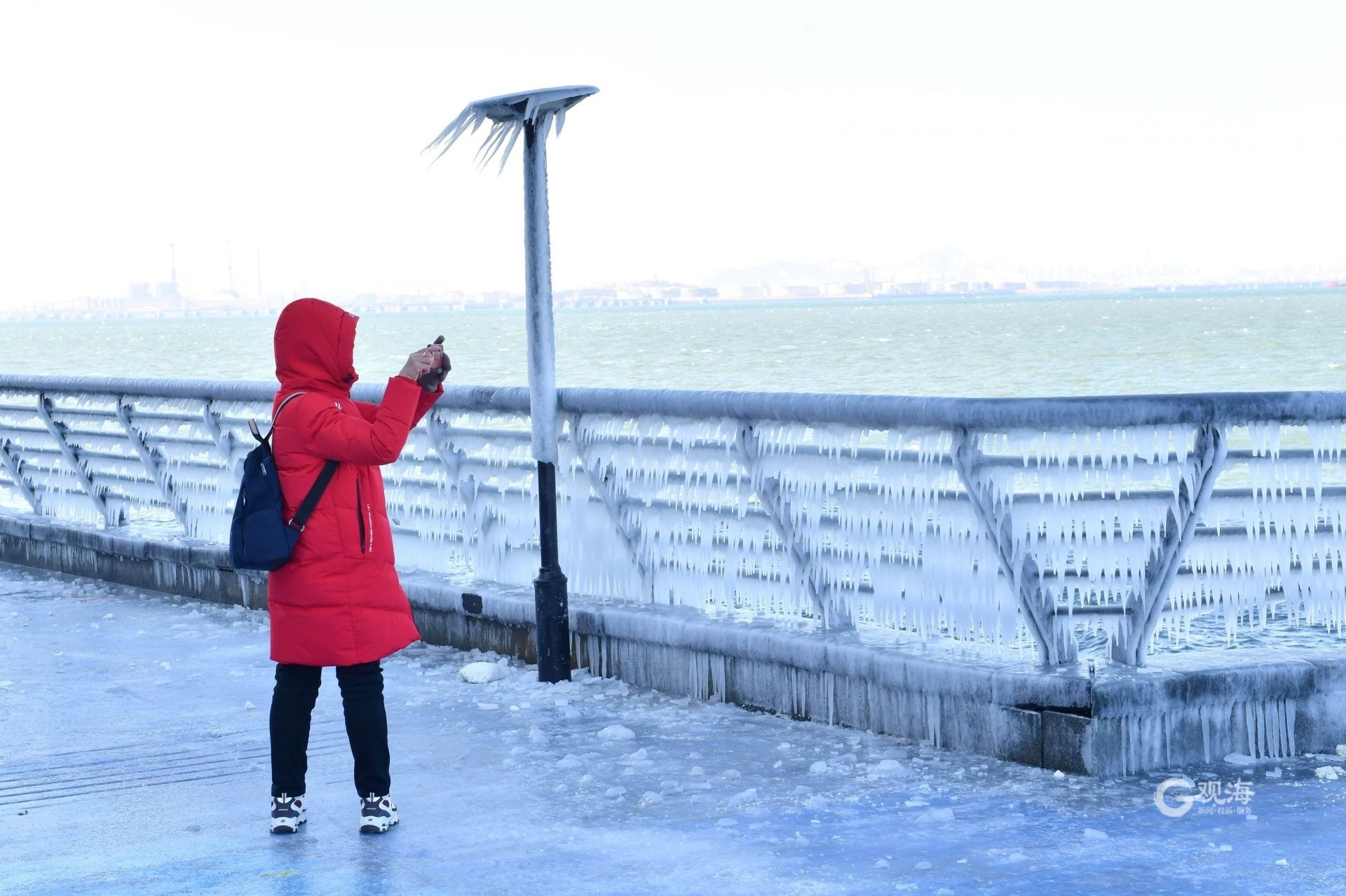 - 12月17日,受强冷空气影响,胶州湾东岸的金茂湾购物中心海滨,拍打上岸的海水结成冰挂景观,吸引了市民冒着寒风拍照。两天前,山东省气象台发布低温橙色预警。