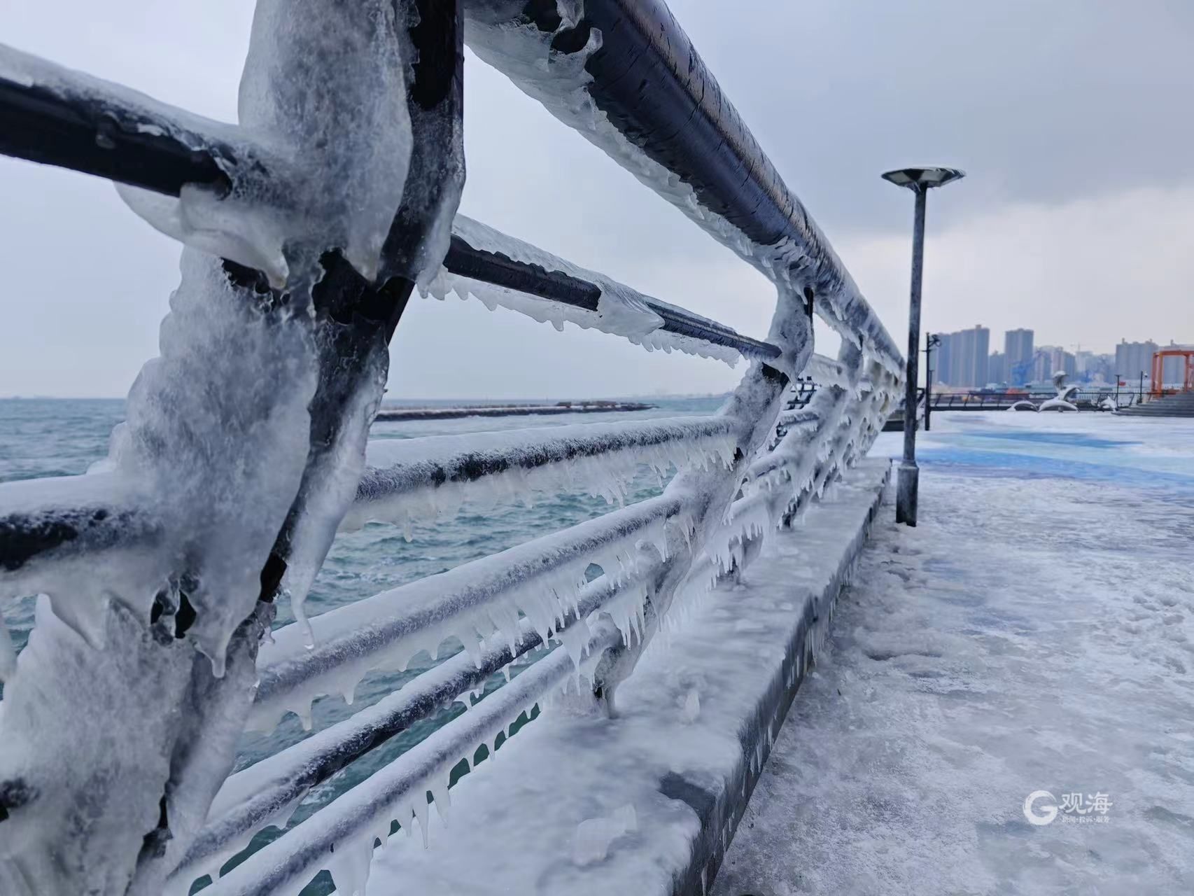 金茂湾附近,海域栏杆上坠满冰挂。青岛日报社/观海新闻记者 闫斯甜 摄