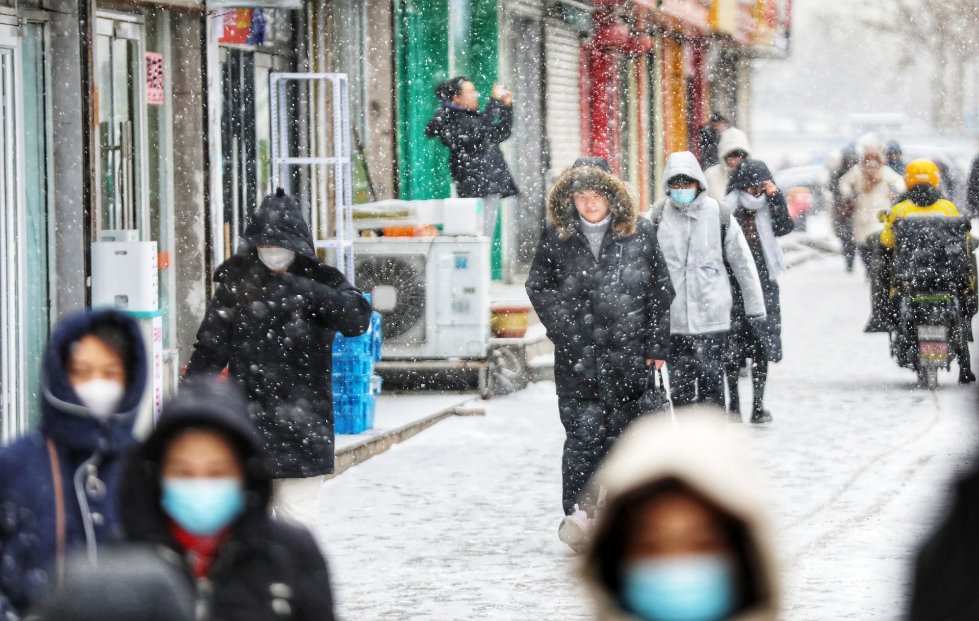 雪中赶路的行人。青岛日报/观海新闻记者 韩星 摄