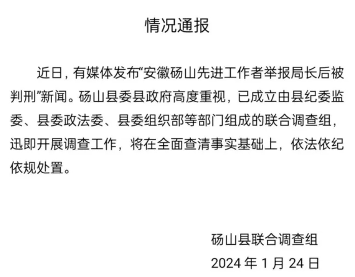 砀山发布官微消息,砀山县联合调查组通报,近日,有媒体发布“安徽砀山先进工作者举报局长后被判刑”新闻。砀山县委县政府高度重视,已成立由县纪委监委、县委政法委、县委组织部等部门组成的联合调查组迅即开展调查工作,将在全面查清事实基础上,依法依纪依规处置。