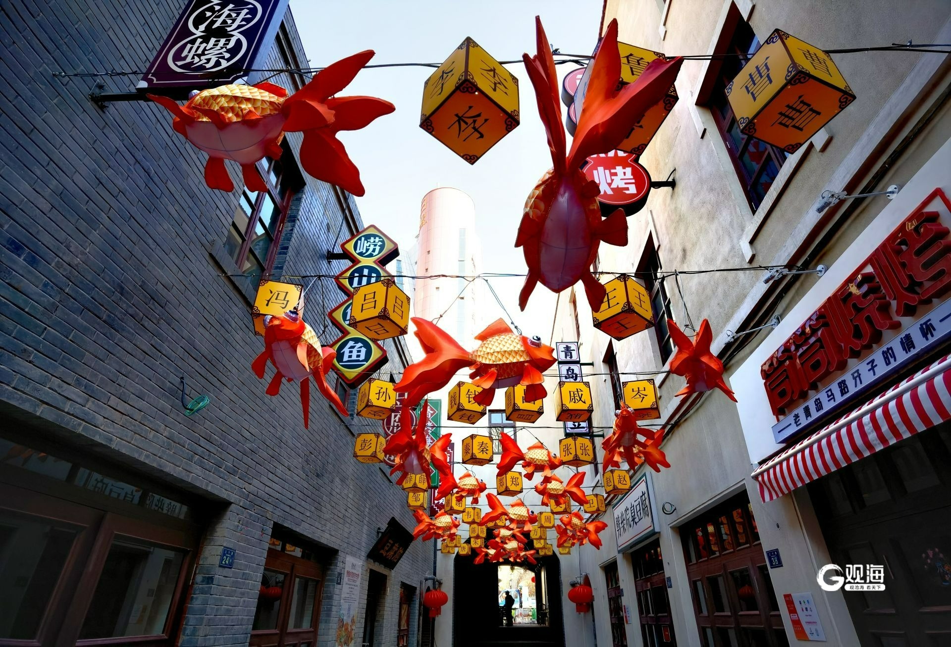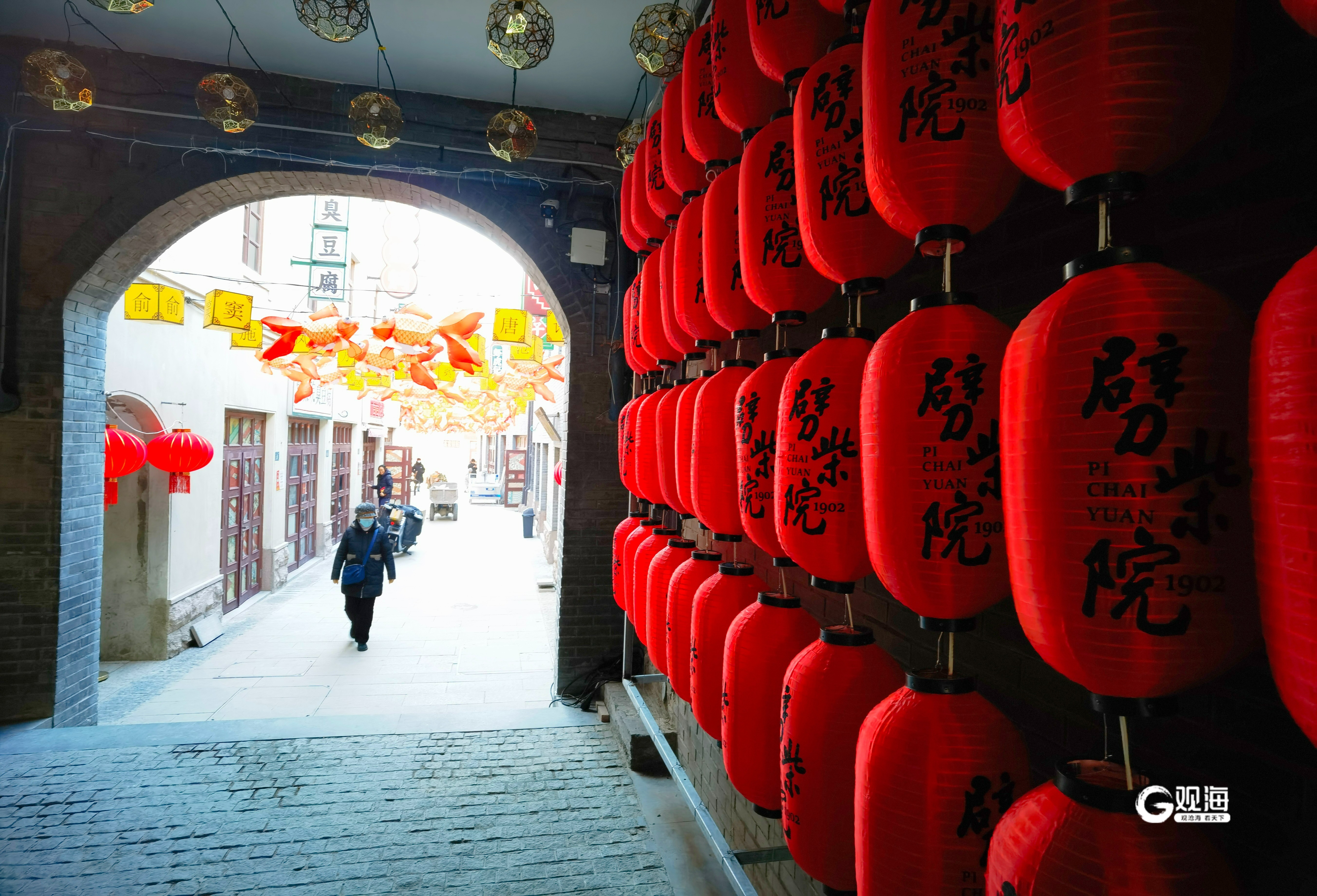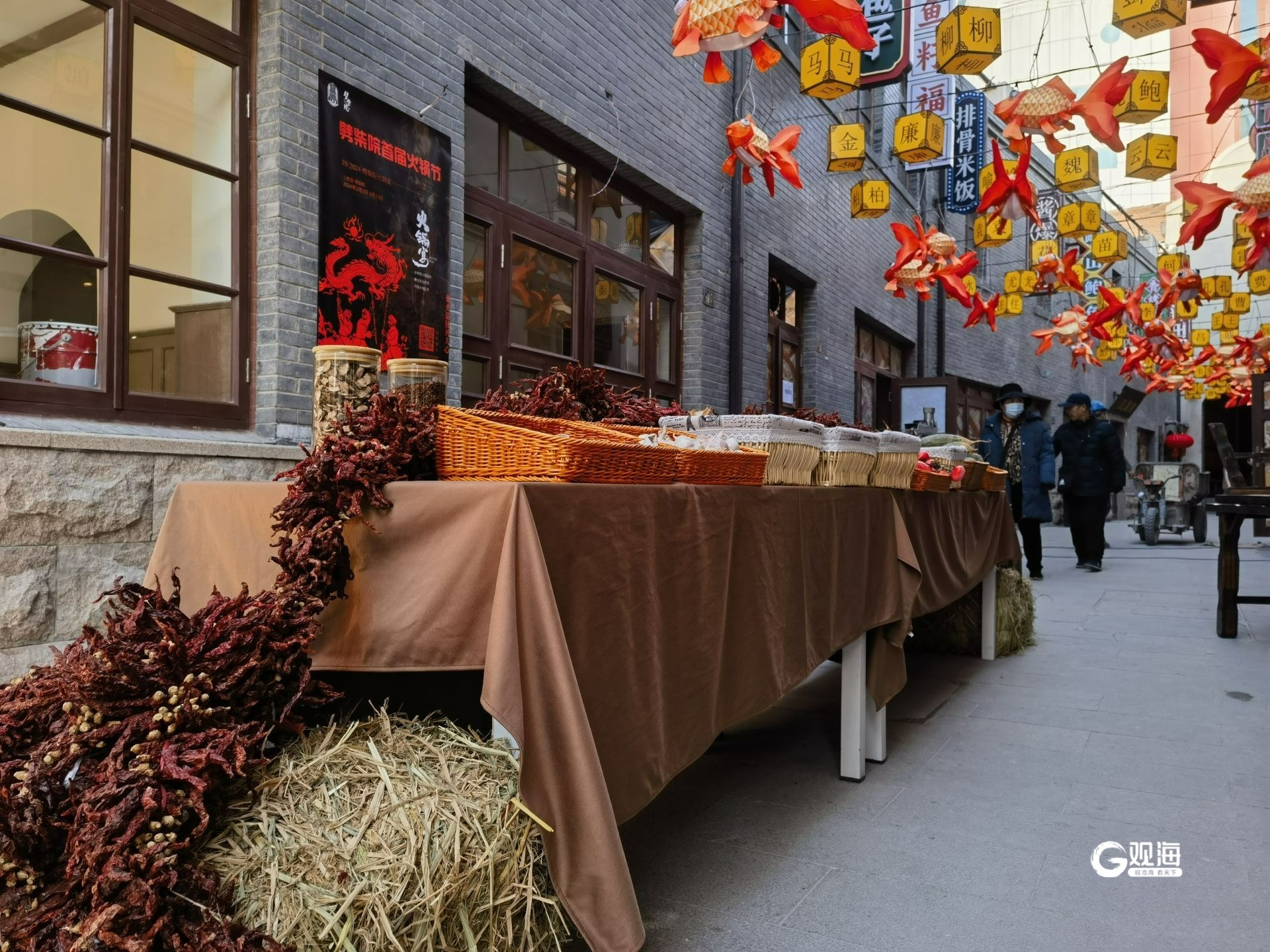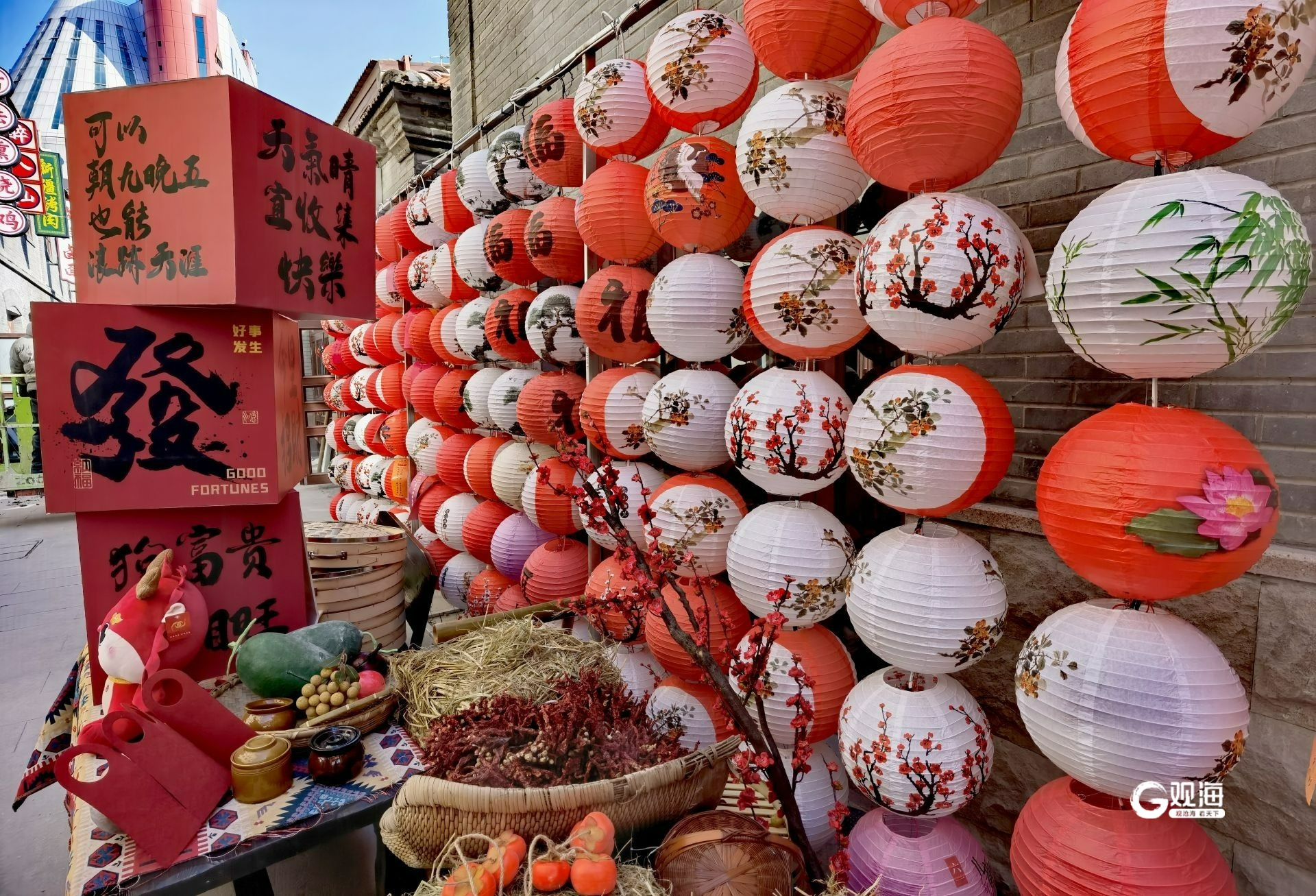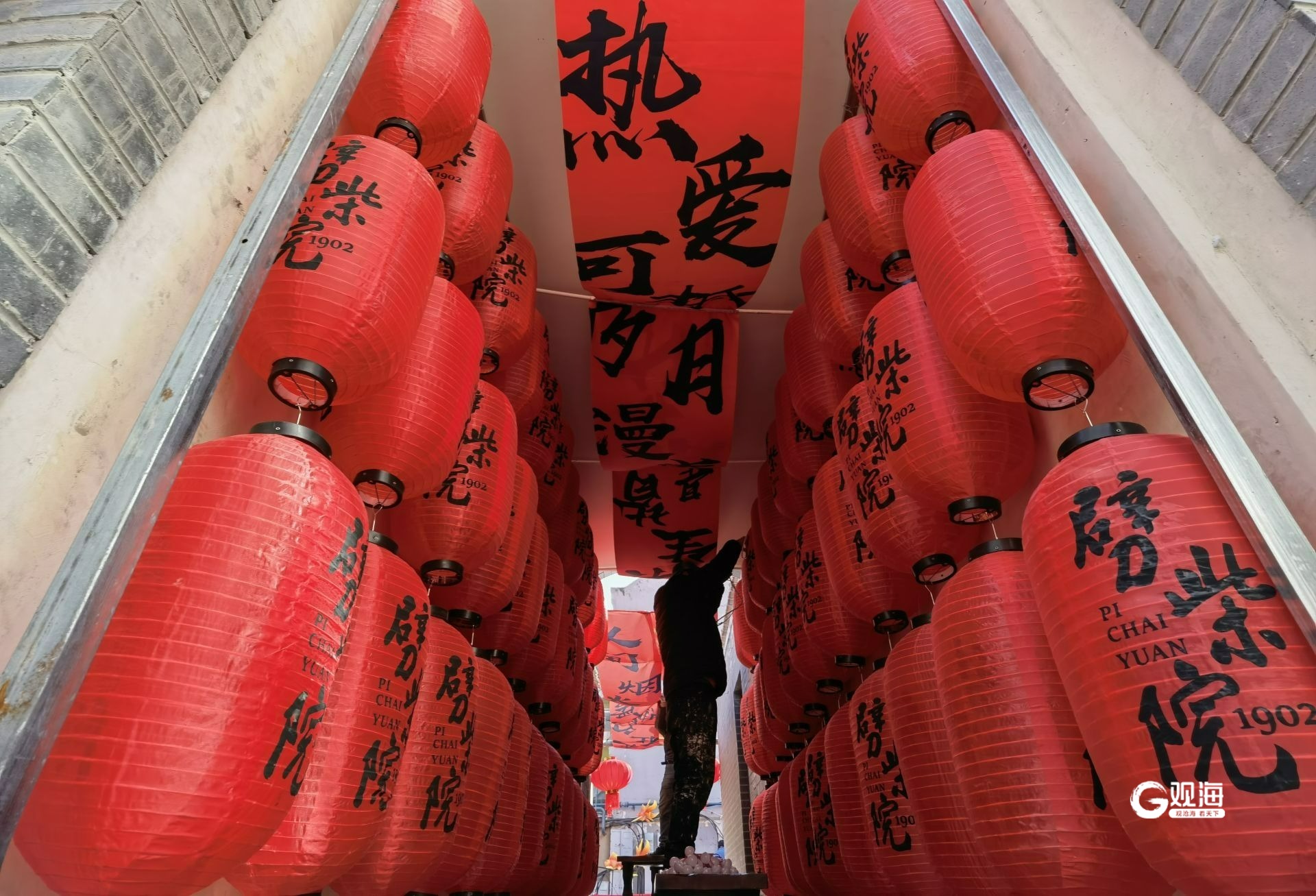 穿过“灯笼墙”走进劈柴院内,工人们正在实施收尾工作,将各种新春饰品组装整理,大多数饰品已经安放得当,象征来年五谷丰登的装饰品摆在小巷的中央,火红的柿子道具也放在院内显眼的位置。一盏盏花灯高高挂起,为小巷增添了传统祥和的感觉,同时也带来了热情与活力的氛围。(青岛日报/观海新闻记者 王雷 摄影报道)
