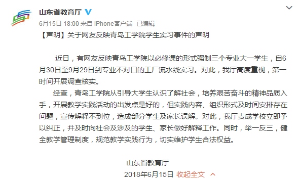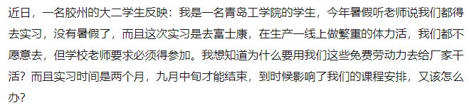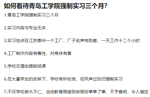 当时,接受调查后,不了了之了。直到后来有网友反映青岛工学院以必修课的形式强制三个专业大一学生,自2018年6月30日至9月29日到专业不对口的工厂流水线实习,这才引发关注,最后被山东省教育厅一纸贴文定了性。