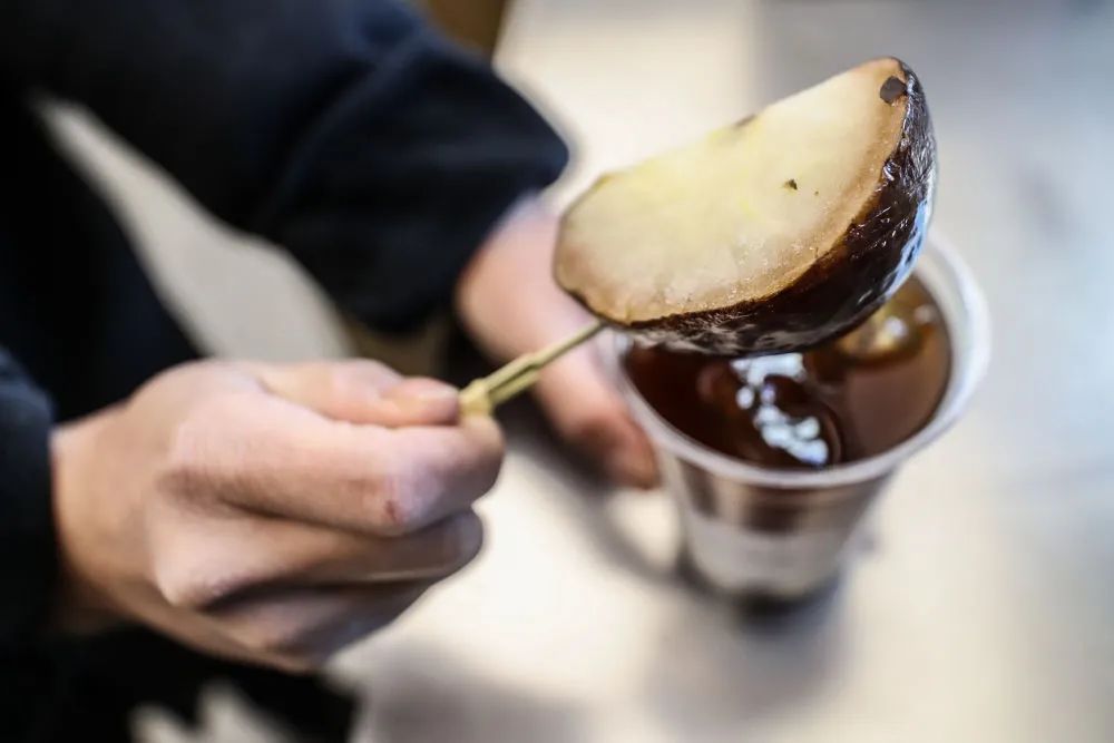 广东游客曾新露捧起一杯“冻梨美式”咖啡,说了声:“行!冻梨看起来不靓,吃起来靓!”曾新露说,自己吃的第一颗冻梨是洗浴中心迎宾大厅里为外地游客备好的见面礼,那是她第一次直观领略到东北人的待客之道。