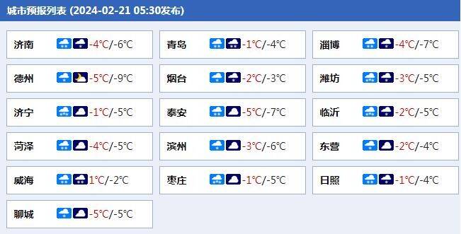 预计21日白天到夜间,菏泽、济宁、枣庄、临沂、日照、济南南部、泰安、淄博南部、潍坊、烟台南部、威海和青岛有中到大雪局部暴雪,聊城、德州、滨州、东营、济南北部、淄博北部和烟台北部有小雪局部中雪;