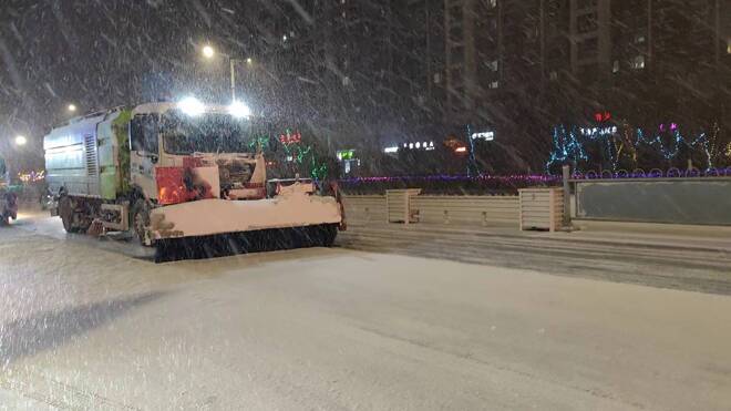 入夜后,随着降雪量增加,城管环卫人员闻雪而动,大型机械全部上路,采取“先主路、后支路”的方式,对城市主干道、重要交通节点、人行道、过街天桥等区域进行全面清理。最大限度减少雨雪冰冻天气对市民出行和市容环境造成的影响,全力保障市民群众生命财产安全。