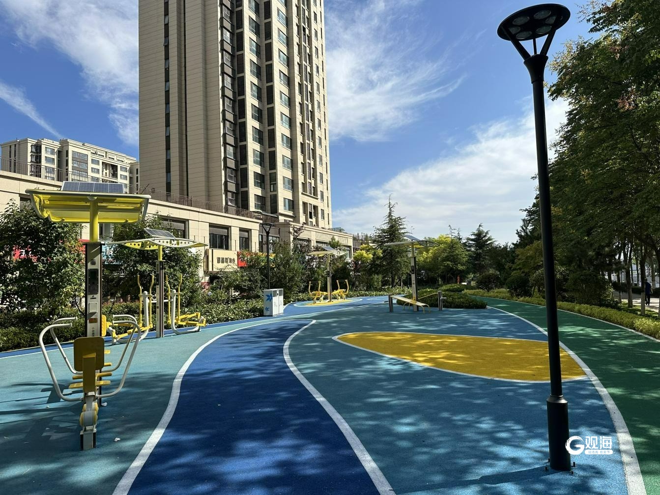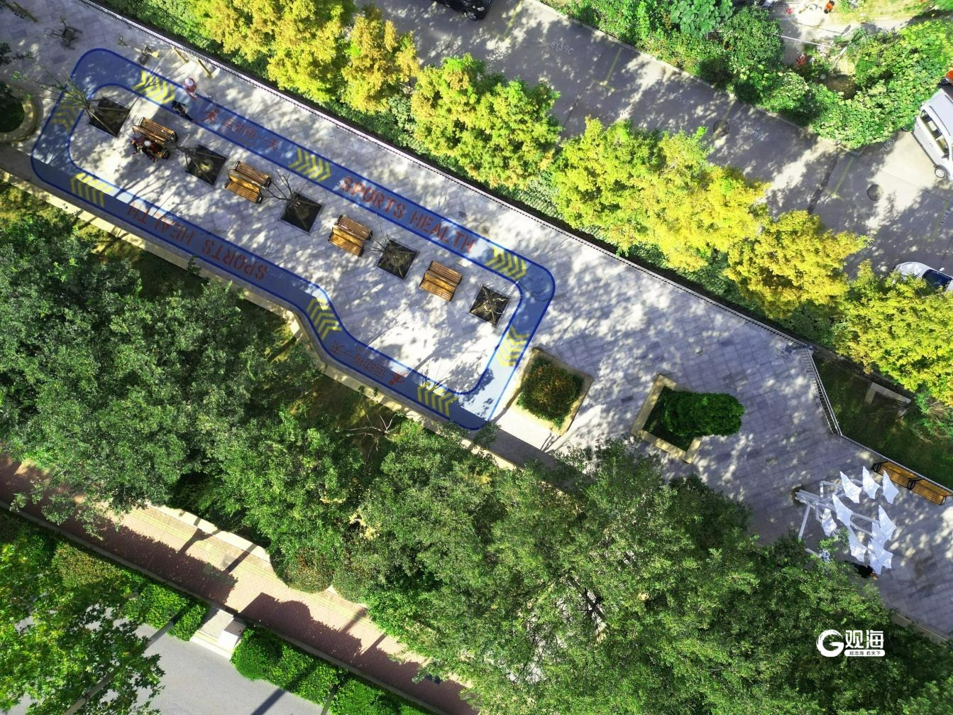 周口路绿道位于市北区周口路西南侧,设计初期充分征求周边居民意见,根据居民实际需求,巧妙利用现有大树,使建成区域达到疏密有致的林荫效果,增设多处适老化活动设施,为周边市民提供一处新的休闲景观空间和慢行林荫路径,得到周边市民一致好评。