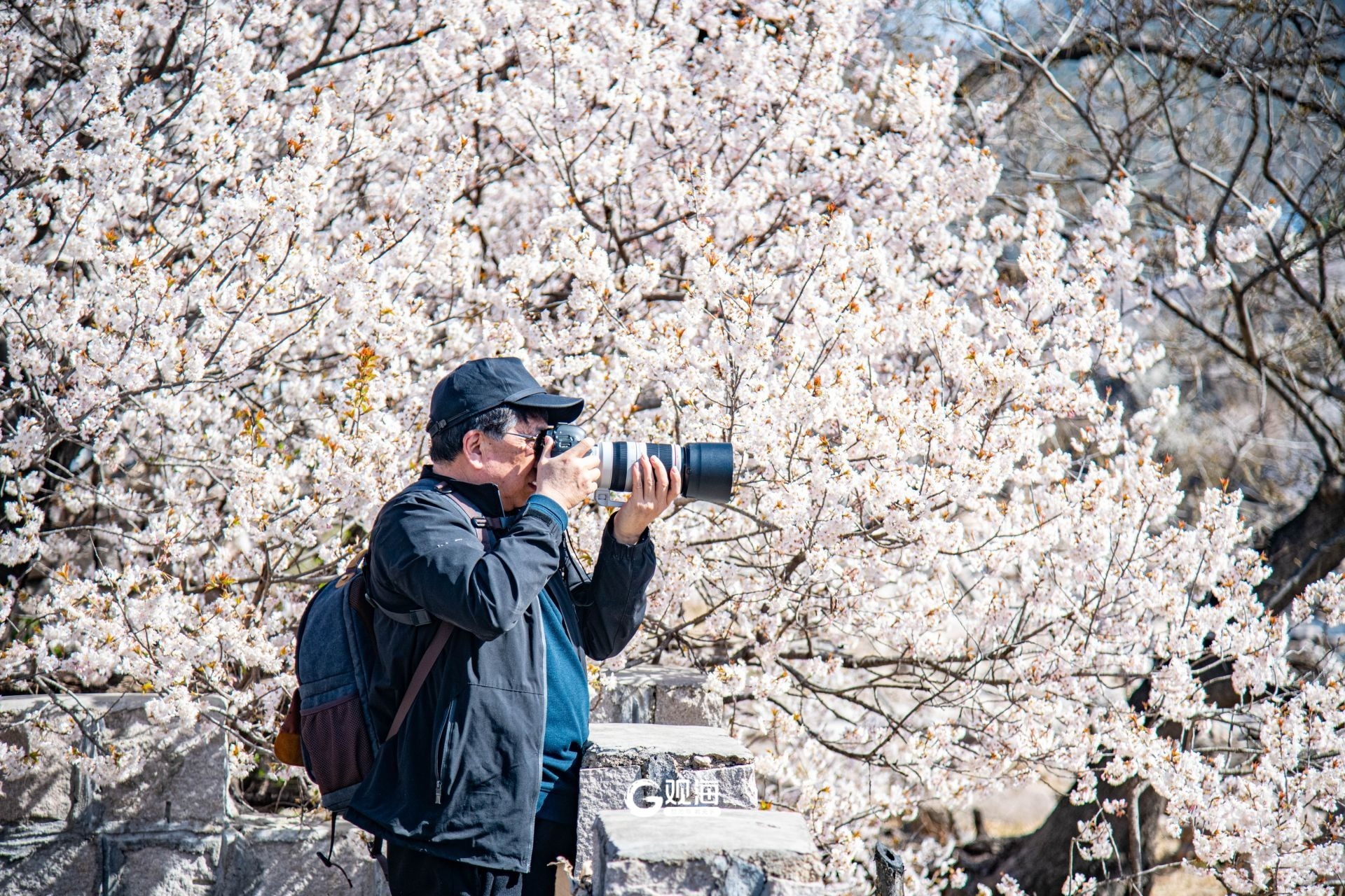 - 游客以花为景留下春天的记忆。