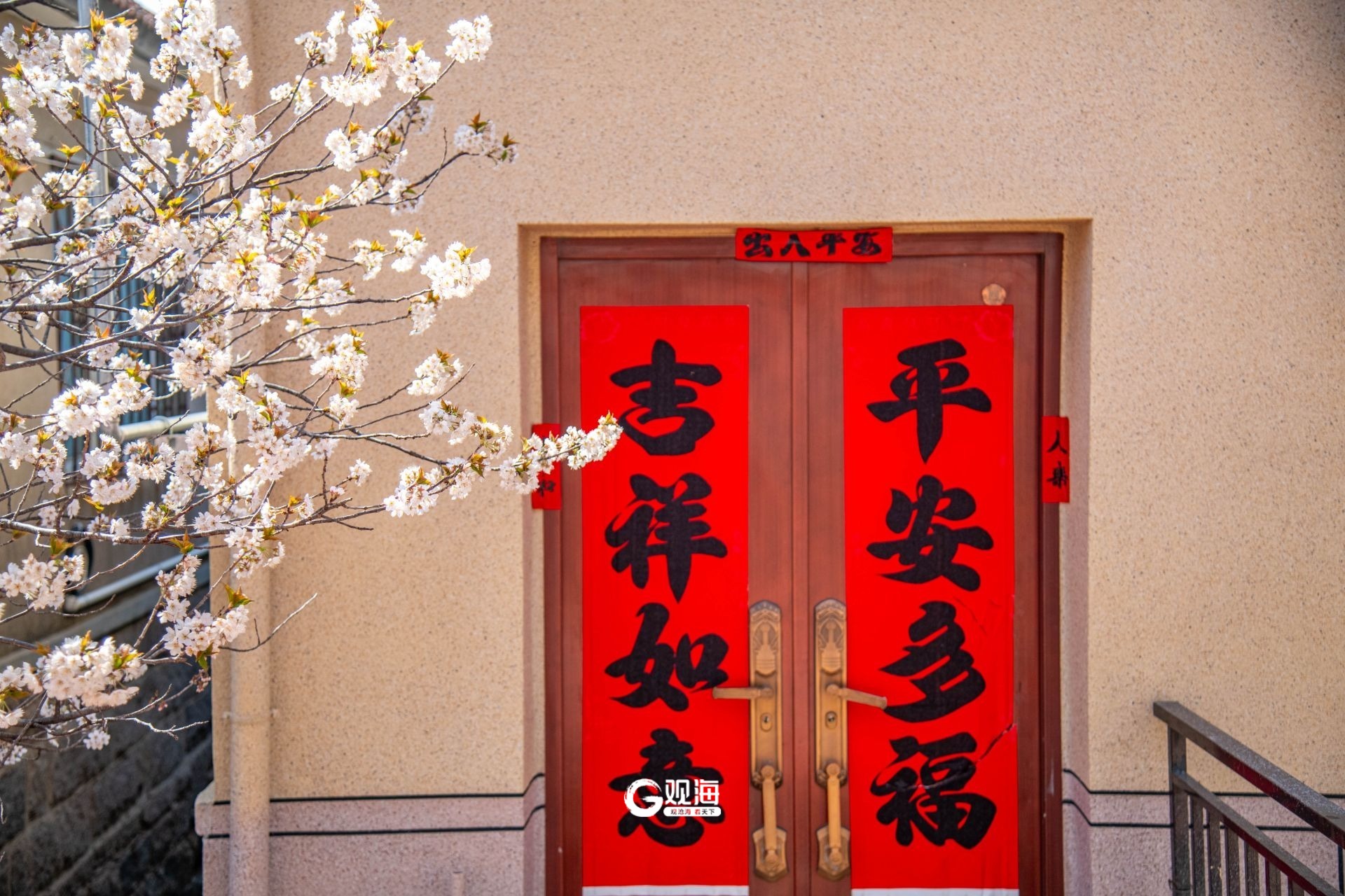 - 盛开的樱桃花与红彤彤的春联相得益彰。