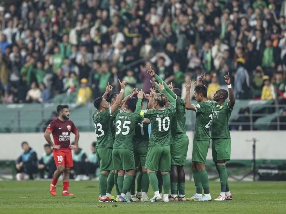 4月5日,北京国安队球员进球后庆祝。新华社记者 胡星宇 摄