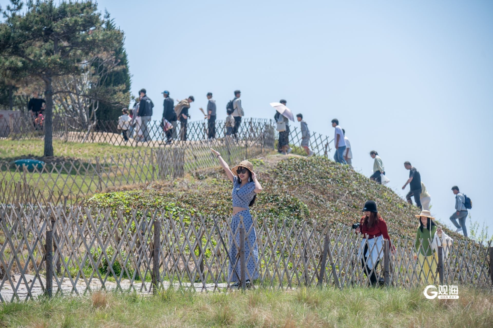 - 游客沿山坡步道拍照、散步。