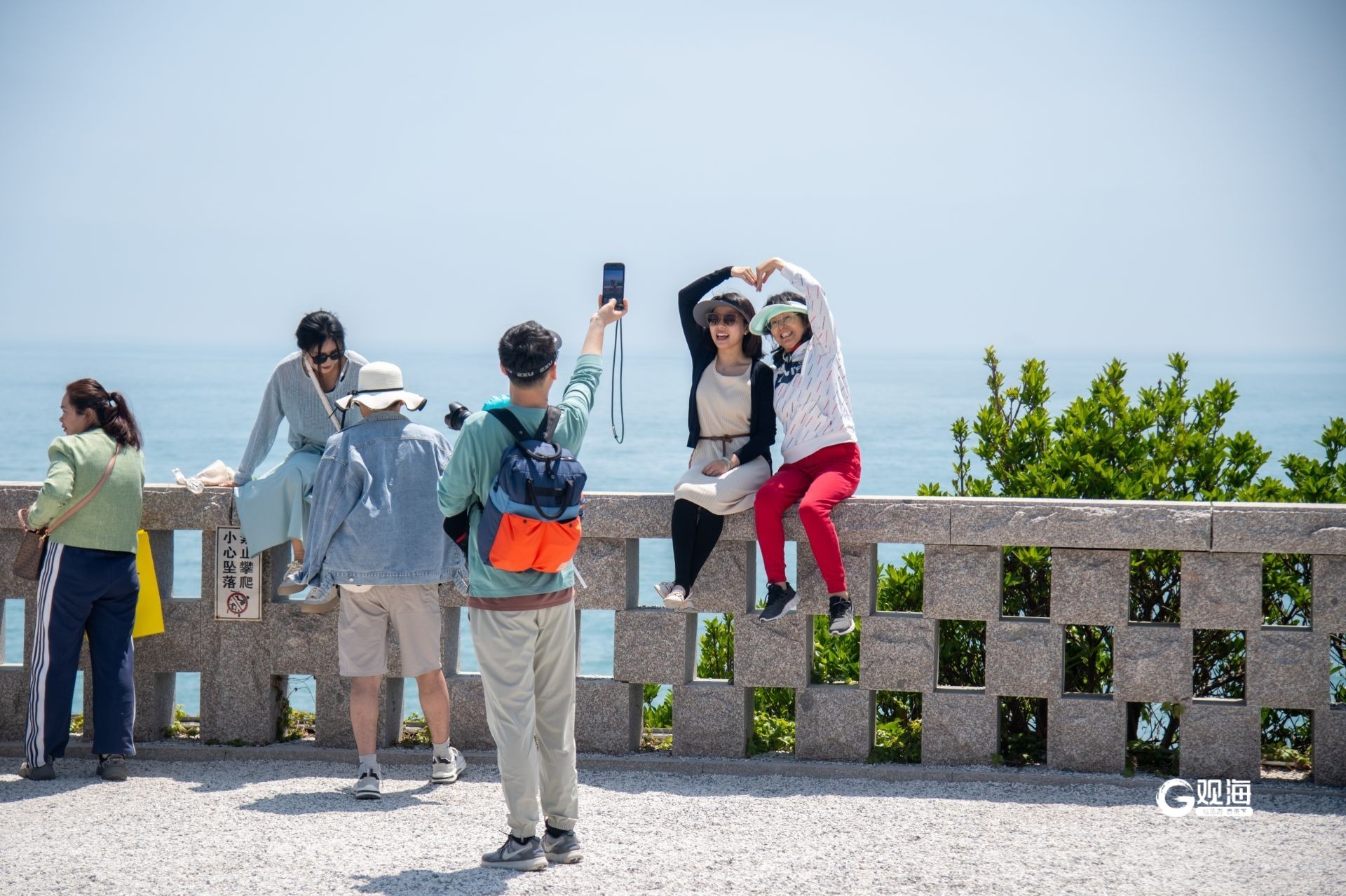 - 游客坐在一处围墙上拍照。
