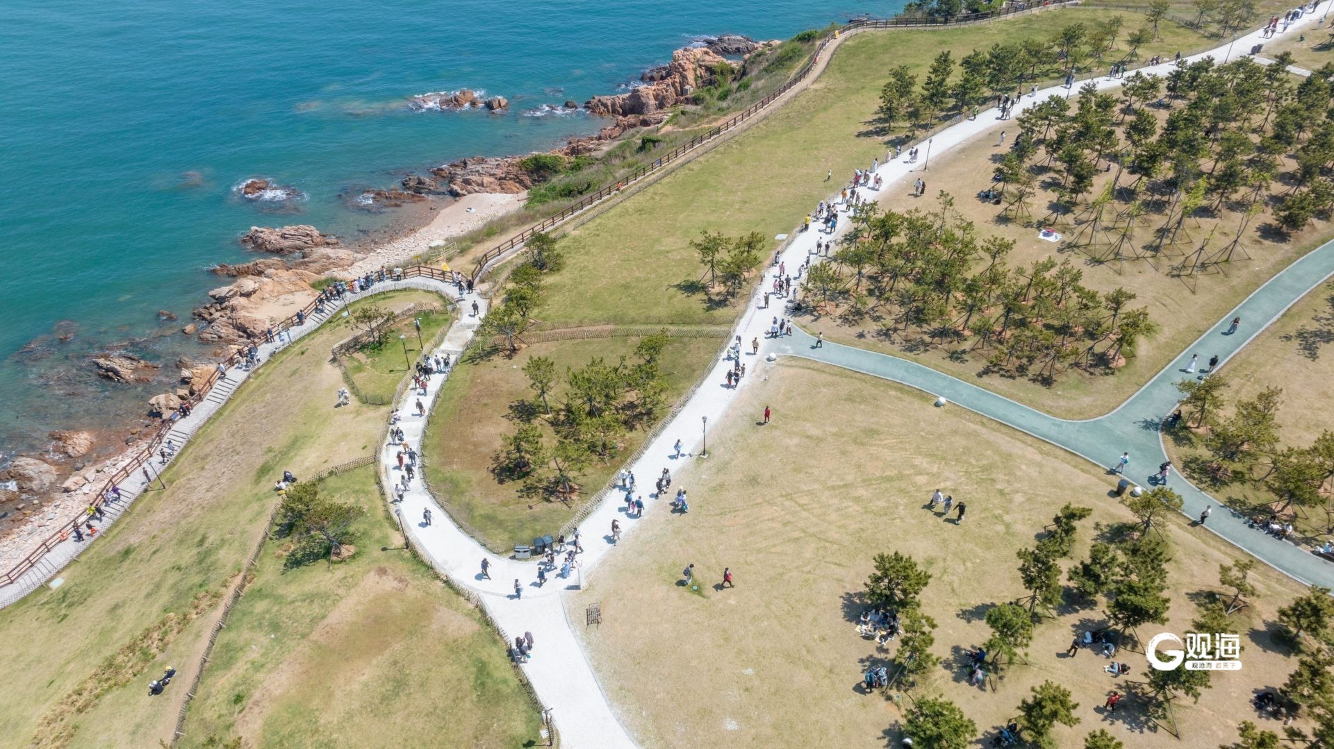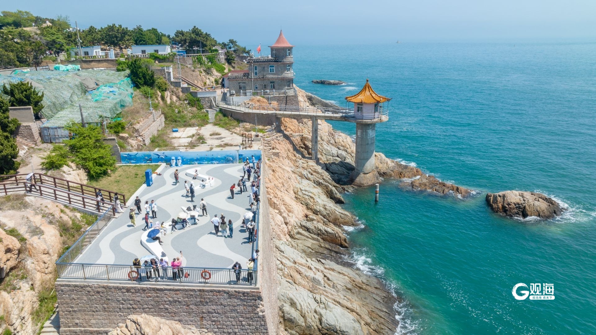 - 小麦岛西南角一处平台成为游客观海的好去处。