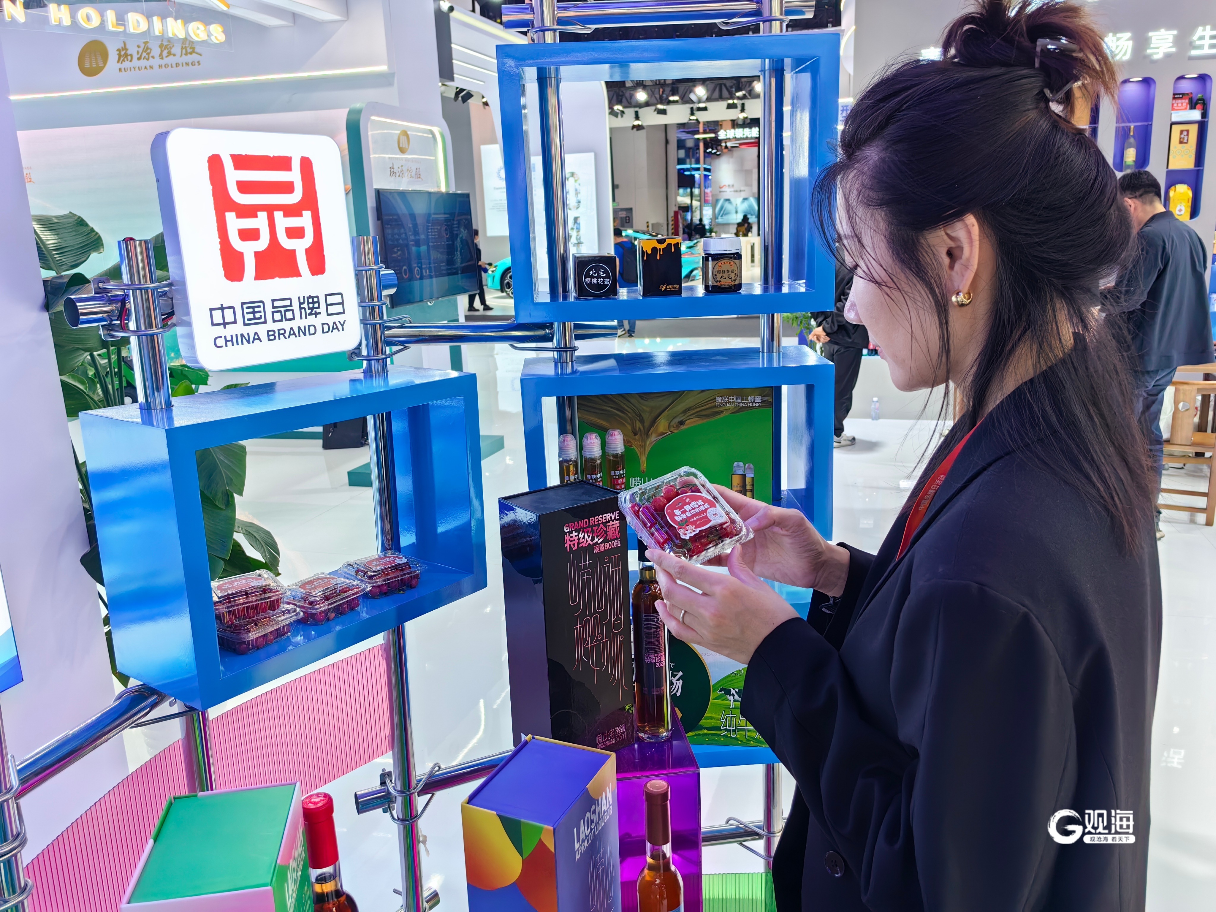 推介会现场,北宅街道还为观众带来了甜蜜好礼,每个席位上都精心准备了一盒当日空运抵沪、清甜红润的“北宅樱桃”。“我还是第一次吃到这种樱桃,不仅看着诱人可爱,味道也是一顶一的棒”“一盒根本吃不够,怎么才能再买到这种樱桃”……甜美可口的“北宅樱桃”让与会嘉宾赞不绝口。除了樱桃,樱桃酒、崂山杏酒、崂山土蜂蜜等“北宅好品”也亮相中国品牌日青岛展馆,向与会嘉宾展示它们独特的魅力。