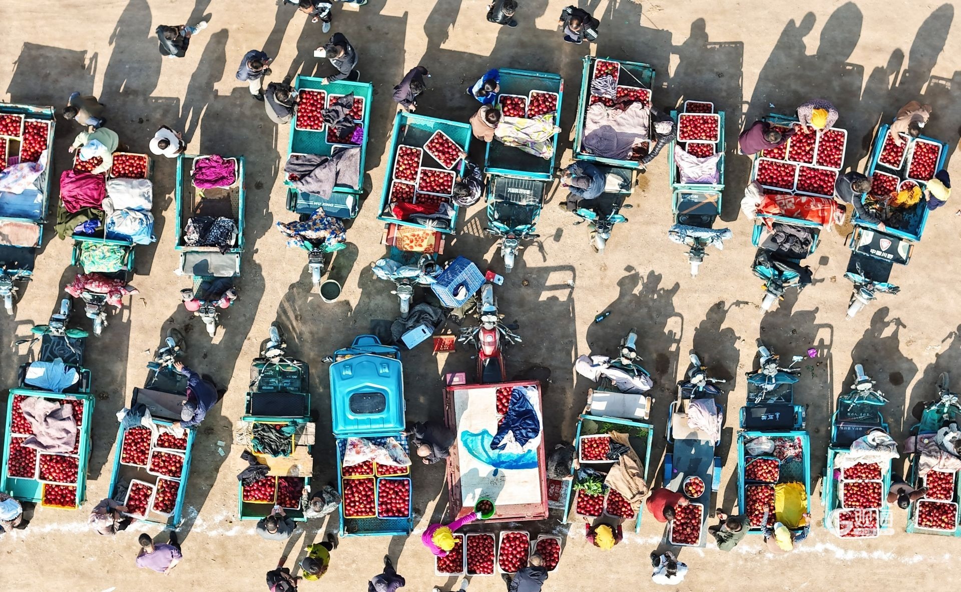 - 在莱西市院上镇王家庄的油桃交易市场,农民在销售刚刚采摘的油桃。