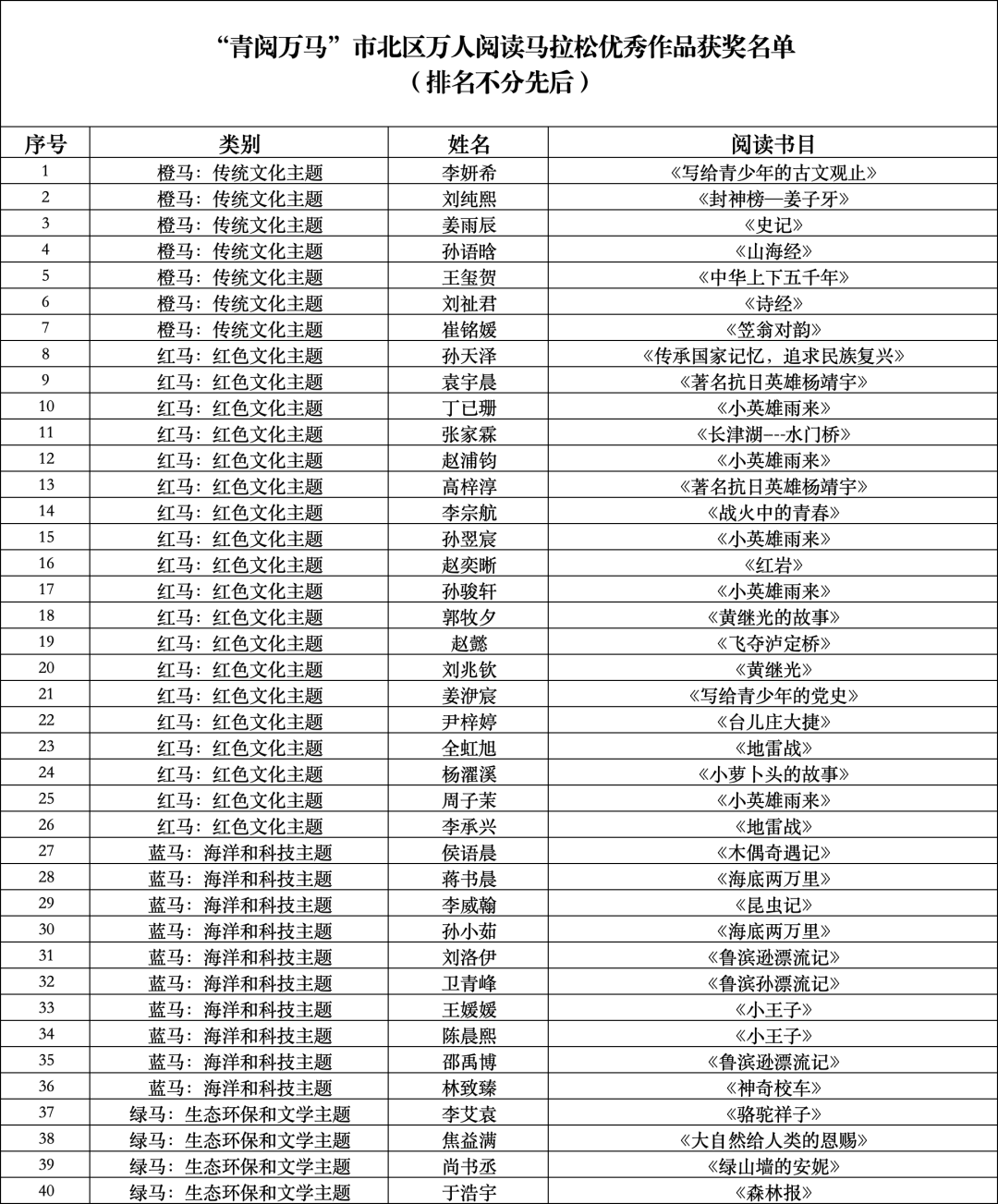 广大读者根据市北区图书馆发布的四大主题阅读书单,选择自己感兴趣的主题书籍,分别开启了代表爱我中华的“青阅红马”、代表生态环保的“青阅绿马”、代表崇尚科技的“青阅蓝马”、代表传统文化的“青阅橙马”,读者以线上数字阅读或线下纸质阅读的形式进行马拉松式阅读,并将读后感进行记录提交。截至活动结束,共收到303份作品,经“书香市北”组委会综合评定,共评选出40名读者获得优秀作品奖励,获奖名单如下: