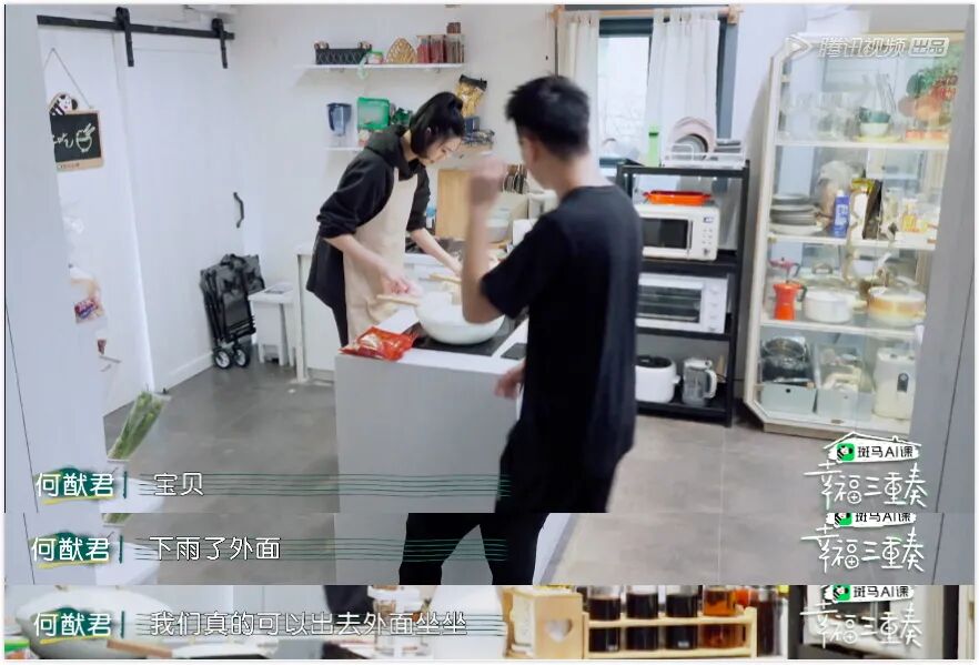 奚梦瑶忙活着煮面,何猷君不会洗菜过来要帮忙,一整颗娃娃菜冲冲水就觉得是洗了,奚梦瑶就说:那我来吧。何猷君看自己搭不上手,突然来了句:宝贝,我们去外面看雨吧。