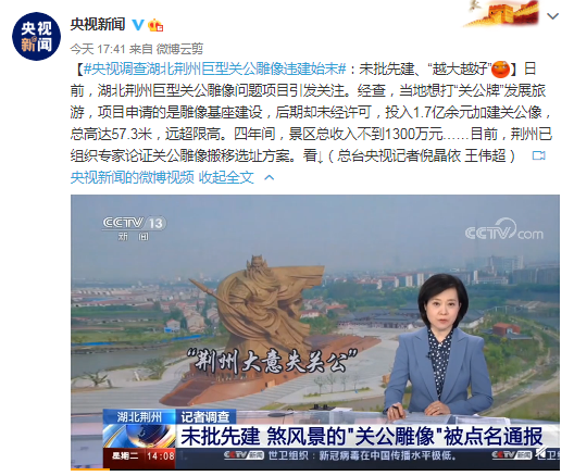 日前,湖北荆州巨型关公雕像问题项目引发关注。经查,当地想打“关公牌”发展旅游,项目申请的是雕像基座建设,后期却未经许可,投入1.7亿余元加建关公像,总高达57.3米,远超限高。四年间,景区总收入不到1300万元……目前,荆州已组织专家论证关公雕像搬移选址方案。(记者 倪晶依 王伟超) 责任编辑:程雪涵 0
