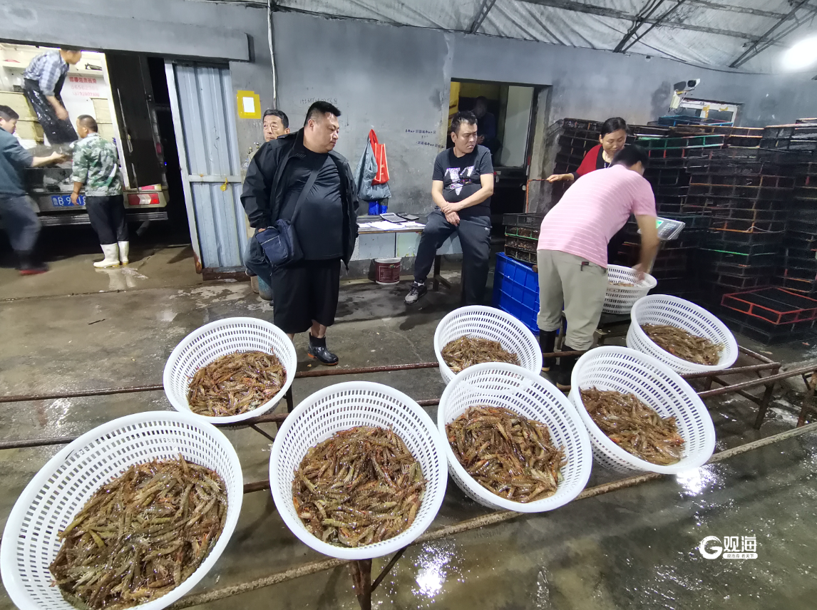一辆辆鲜虾运输车开进交易站,一筐筐鲜虾在这里分拣,重新装箱运走。一名正在分拣鲜虾的工人说,这些鲜虾不仅看着漂亮,吃起来更是美味可口。为了最大可能保证鲜活,一般从捕捞到市场,整个过程都要在晚上完成。