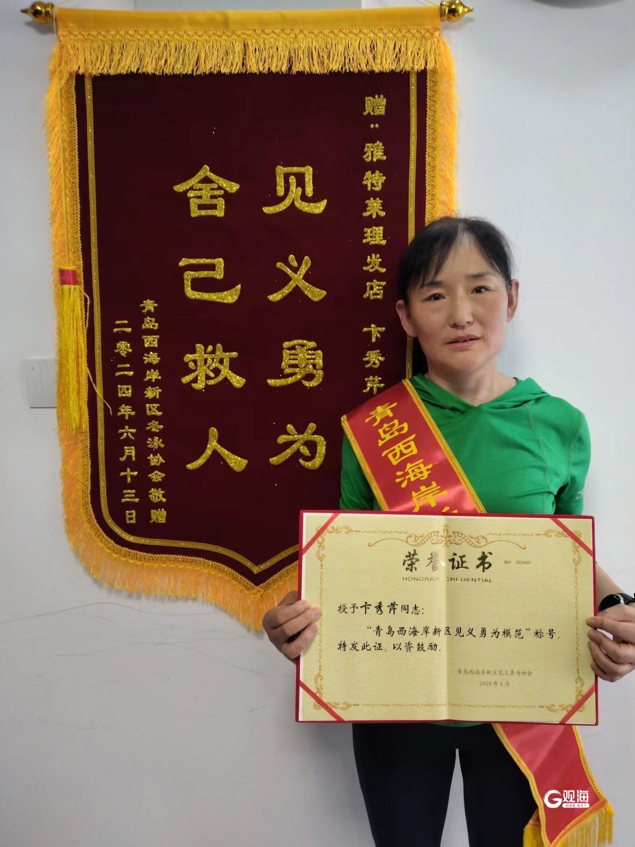 卞秀芹荣膺“青岛西海岸新区见义勇为模范”。受访者供图