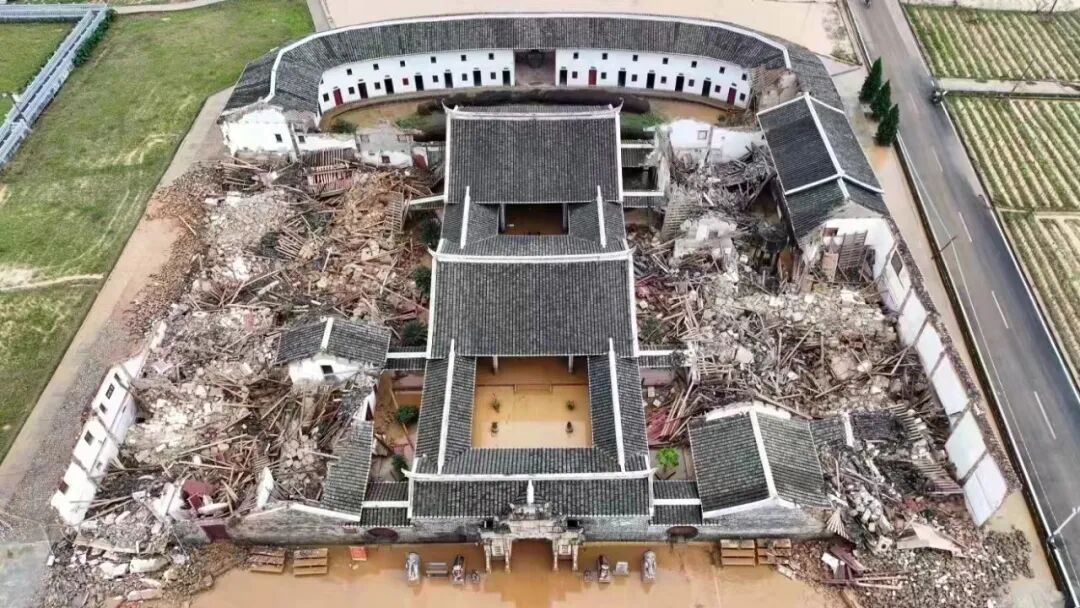 另据澎湃新闻,“客家第一祠”福建省龙岩市上杭县官田李氏大宗祠受特大暴雨袭击,发生大面积坍塌。