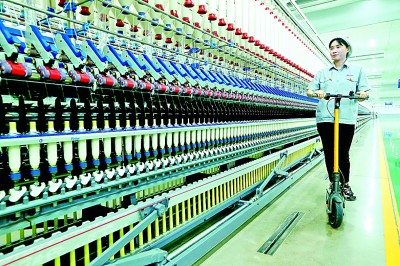工人在位于山东省青岛市即墨区龙山街道的青岛即发纺织科技公司智慧纺纱生产线上巡检。梁孝鹏摄/光明图片