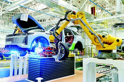 山东省青岛市一家新能源汽车制造企业的总装车间,智能机械臂在安装车轮。梁孝鹏摄/光明图片