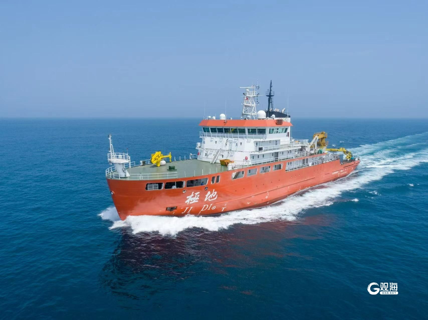 “极地”号破冰调查船是中国自主设计、建造的中国新一代破冰科考船。“极地”号全长89米、型宽17.8米、型深8.2米,设计航速15节,排水量6600吨,续航力为14000海里,船艏可破0.8-1米厚当年冰,在1米厚的当年冰区中的破冰航速可达2节。该船冬季可航行于我国黄、渤海海域进行冰区海洋环境监测调查,兼顾冰区救助,并具备夏季极地海域科学考察能力,是参与我国极地考察的重要力量。该船搭载了多种海洋调查设备,能够承担海冰、三维水体、地球物理、大气等海洋环境的综合观测调查任务。“极地”号于6月24日正式命名交付,此次出征北极为首航科考任务,也是第一次向公众开放。