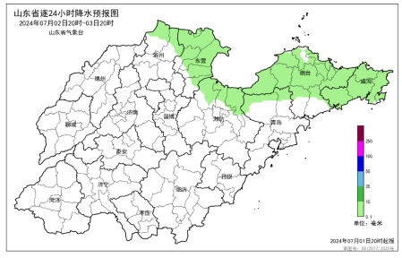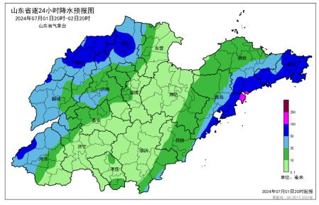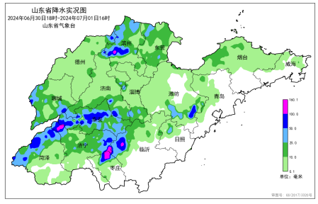 山东省气象台降水数据显示,6月30日18时至7月1日16时,全省共有16市105县(区市)、1348乡镇出现降水,平均降水量10.1毫米,折合水量约15.8亿方。各市平均:泰安31.6毫米、济宁19.1毫米、滨州18.3毫米、菏泽15.9毫米、聊城14.1毫米、枣庄13.2毫米、东营10.9毫米、济南10.8毫米、淄博7.5毫米、临沂7.2毫米、潍坊4.8毫米、德州4.6毫米、烟台3.9毫米和日照1.2毫米,其他市不足1.0毫米。降水量前3位的是气象监测站为:枣庄山亭冯卯160.1毫米、济宁梁山小安山156.1毫米和济宁邹城城前147.7毫米。