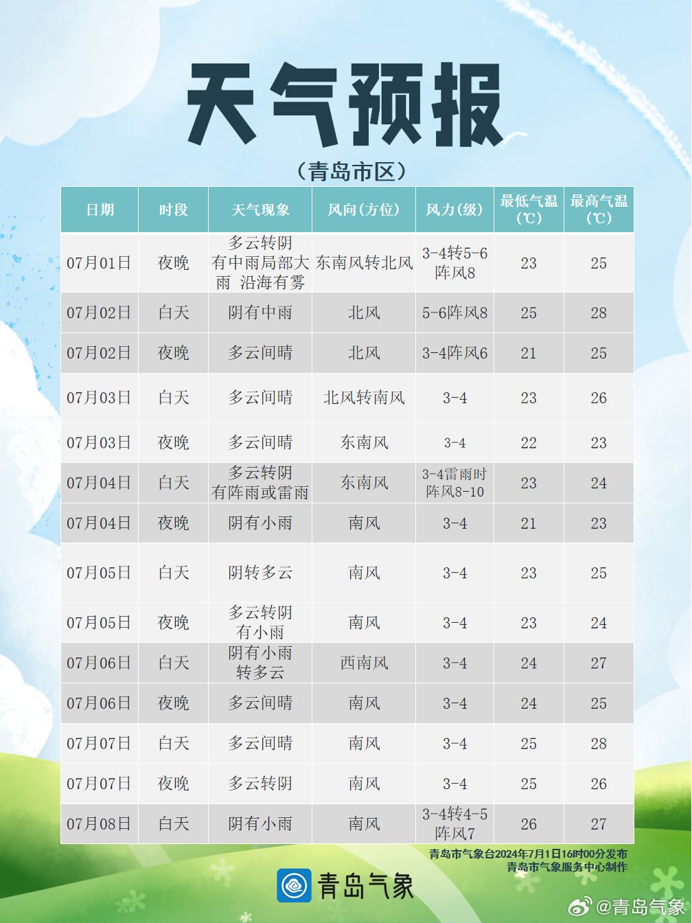 【青岛市区】今天夜间,多云转阴有中雨局部大雨,沿海有雾,东南风3到4级转北风5到6级阵风8级,明天白天,阴有中雨,北风5到6级阵风8级,相对湿度60%-100%,明天最低气温23℃,最高气温28℃。2日夜间到3日白天:多云间晴,北风转南风3到4级阵风6级,21到26℃。3日夜间到4日白天:多云转阴有阵雨或雷雨,东南风3到4级雷雨时阵风8到10级,22到24℃。
