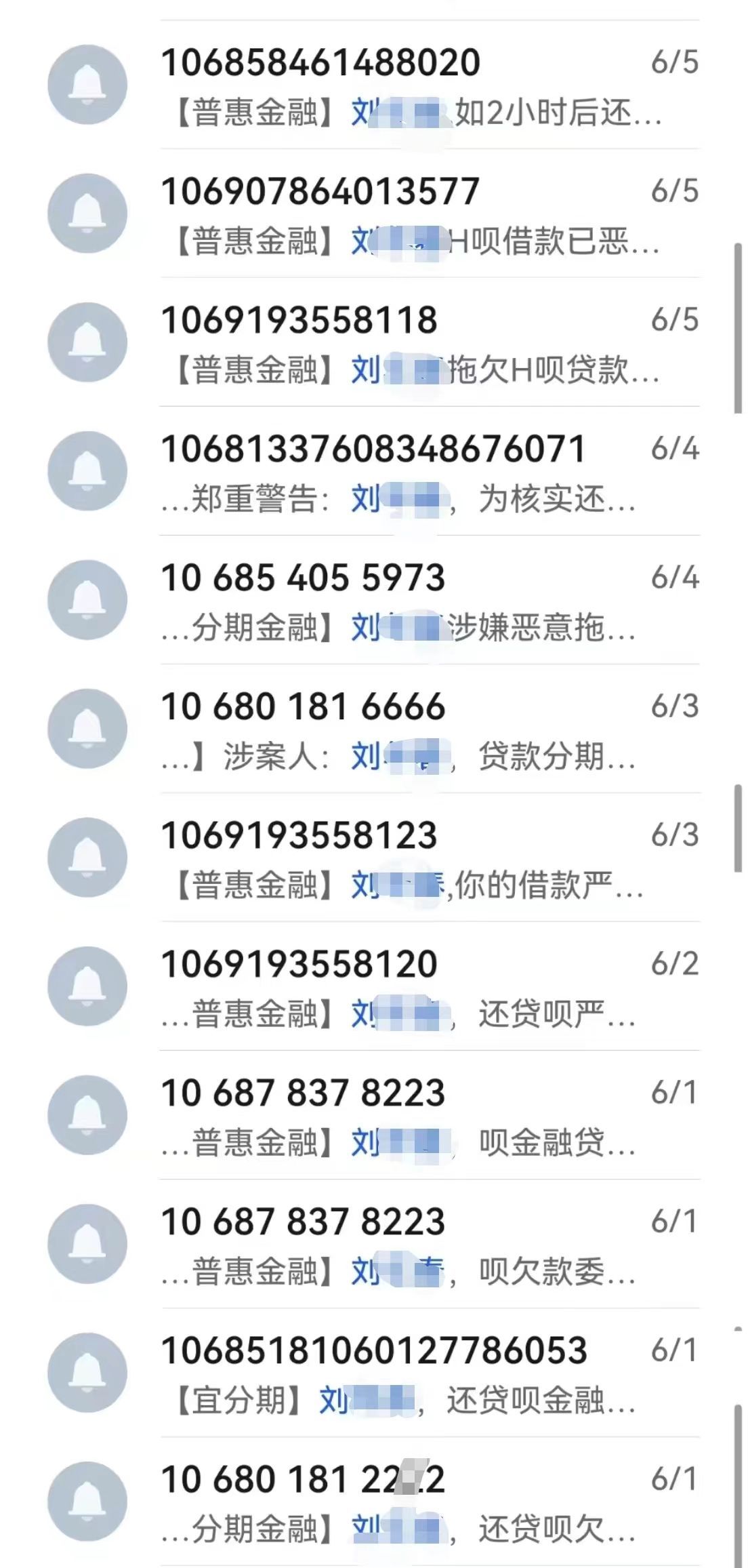 中午11点多,他又收到该106开头的号码发来的信息,“【分期金融】刘某某,还贷呗欠款沟通后仍拒还,资料已核实完毕,现将出发到平台预留地址,全额收缴并联合当地村(居)委陪同全款清收,拒收请回复R。”