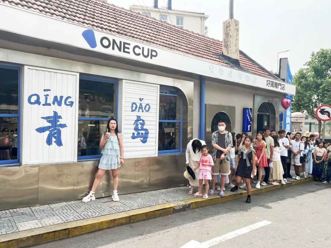 青岛龙江路上的饮品店,吸引游客排队打卡拍照