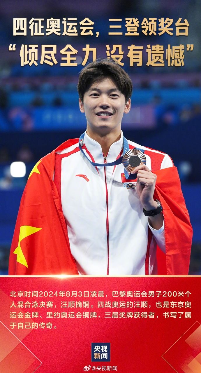 2012年,伦敦奥运会,汪顺18岁,首次亮相奥运会; 2016年,里约奥运会,汪顺22岁,摘得男子200米个人混合泳铜牌; 2021年,东京奥运会,汪顺27岁,以1分55秒00的成绩打破亚洲纪录,并夺冠; 2024年,巴黎奥运会,汪顺30岁,摘得一枚铜牌。 与泳池相伴20多年,汪顺用实力和努力,书写了属于自己的传奇。愿热爱可抵岁月漫长,加油! 责任编辑:孙飞 0