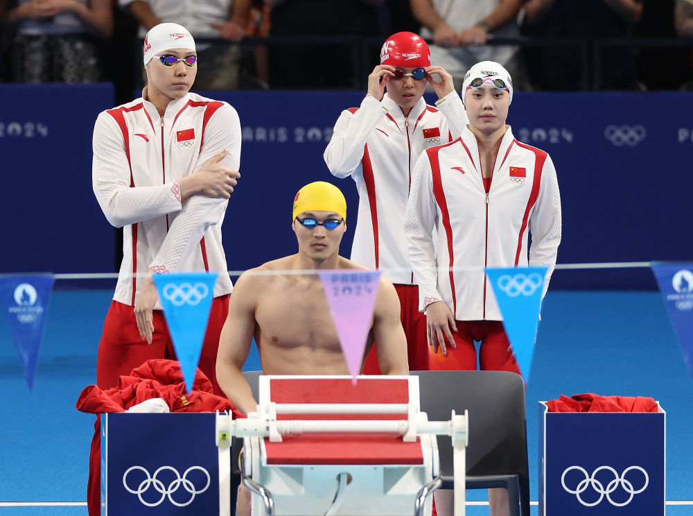 8月3日,亚军中国队选手覃海洋、徐嘉余、杨浚瑄、张雨霏(从左至右)在比赛前。当日,巴黎奥运会游泳项目男女4X100米混合泳接力决赛在拉德芳斯体育馆举行。新华社记者 雒圆 摄