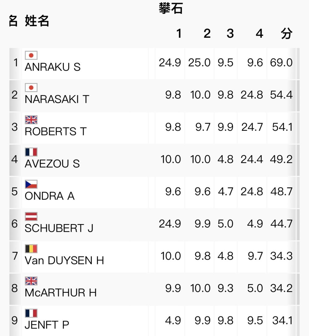 (随堂小考,来看看新鲜出炉的巴黎奥运会男子全能资格赛攀石赛的积分表,你能看懂每名选手在各条线路上的攀爬状态吗?图中谁top了两条线?)