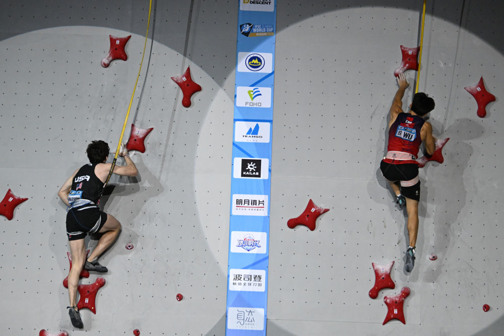 4月13日,中国选手伍鹏(右)与美国选手塞缪尔·沃森在2024年国际攀联攀岩世界杯(吴江站)男子速度决赛中。新华社发(王须中摄)