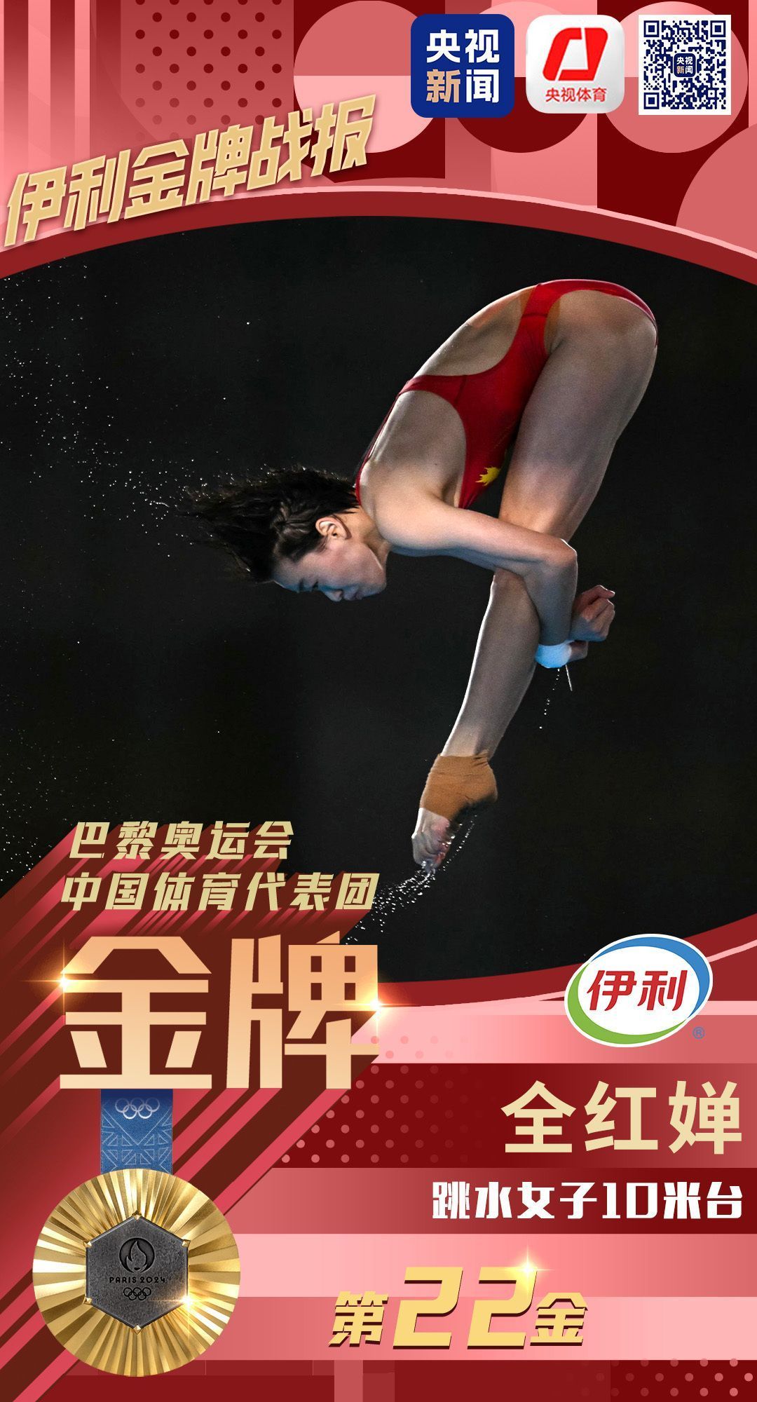 8月6日,在巴黎奥运会跳水女子10米台决赛中,中国选手全红婵夺得金牌,陈芋汐摘银。这枚金牌是中国代表团在本届奥运会获得的第22枚金牌。