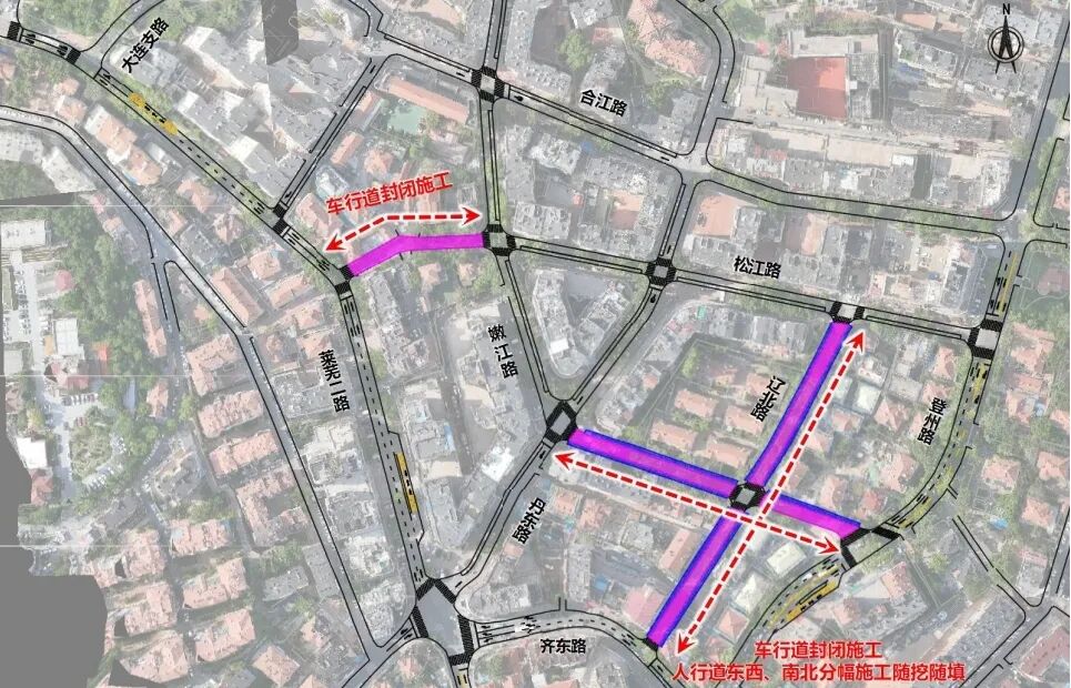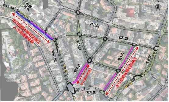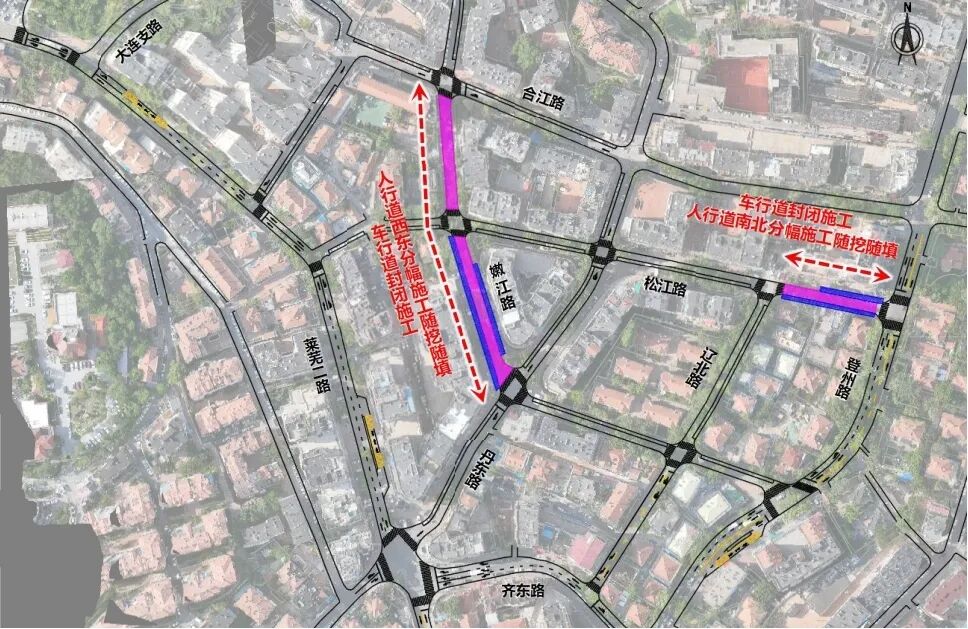 占用辽北路(松江路-齐东路)路段、嫩江路(丹东路-登州路)路段封闭施工,过境车辆通过齐东路、丹东路、松江路、登州路等周边道路绕行。