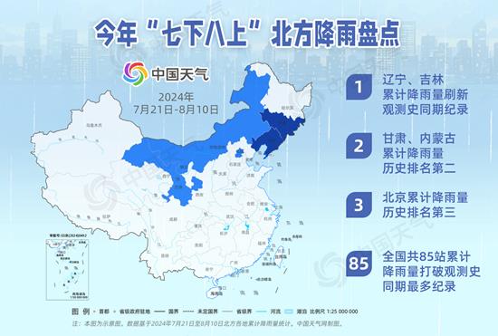 “今年7月21日至8月10日期间,我国北方平均降雨量较常年同期偏多,一共出现了5轮强降雨天气过程。”其中,辽宁、吉林累计降雨量刷新历史同期纪录,甘肃、内蒙古历史第二,北京历史第三。