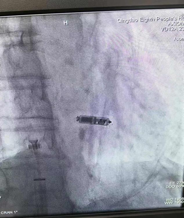 该手术极具挑战性。患者入院后心电图提示二度II型房室传导阻滞,心率持续缓慢,最慢时心率仅每分钟28次,具有永久起搏器植入指征。这名患者年事已高,且患慢阻肺,有反复咳喘、营养不良病史,正常植入起搏器囊袋感染、电极穿孔及脱落风险较高。心内科主任曹庆博、杨德玉医生与专家团队经过多次讨论和研究后,为患者量身制定了缜密的手术方案,植入目前世界上最小的起搏器——双腔无导线起搏器。
