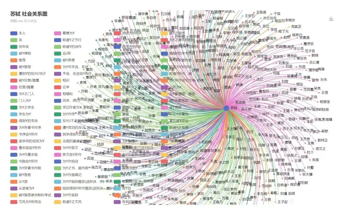 有网友绘制了“苏轼社会关系图”,惊叹其不愧为北宋最“e”的人。在欧阳修的“好评转发”下,苏轼成了“京城顶流”。哪怕是苏轼的“官场死对头”王安石,也在“乌台诗案”中为他求情,晚年还邀请他做自己的邻居。他在黄州和岭南时,每日晨起便有访客到来,堪称北宋时期的“苏坡爱豆”。