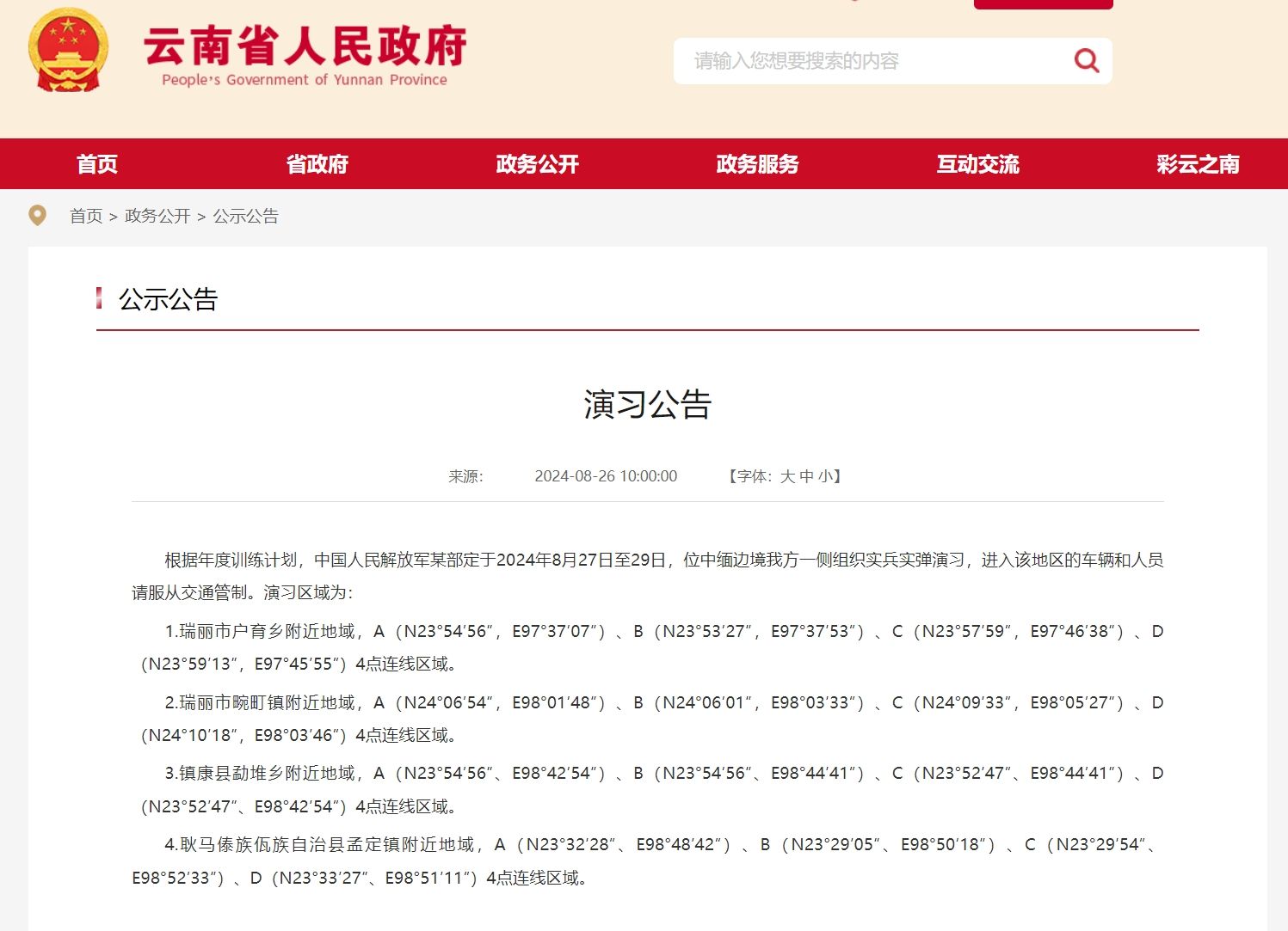根据年度训练计划,中国人民解放军某部定于2024年8月27日至29日,位中缅边境我方一侧组织实兵实弹演习,进入该地区的车辆和人员请服从交通管制。演习区域为: