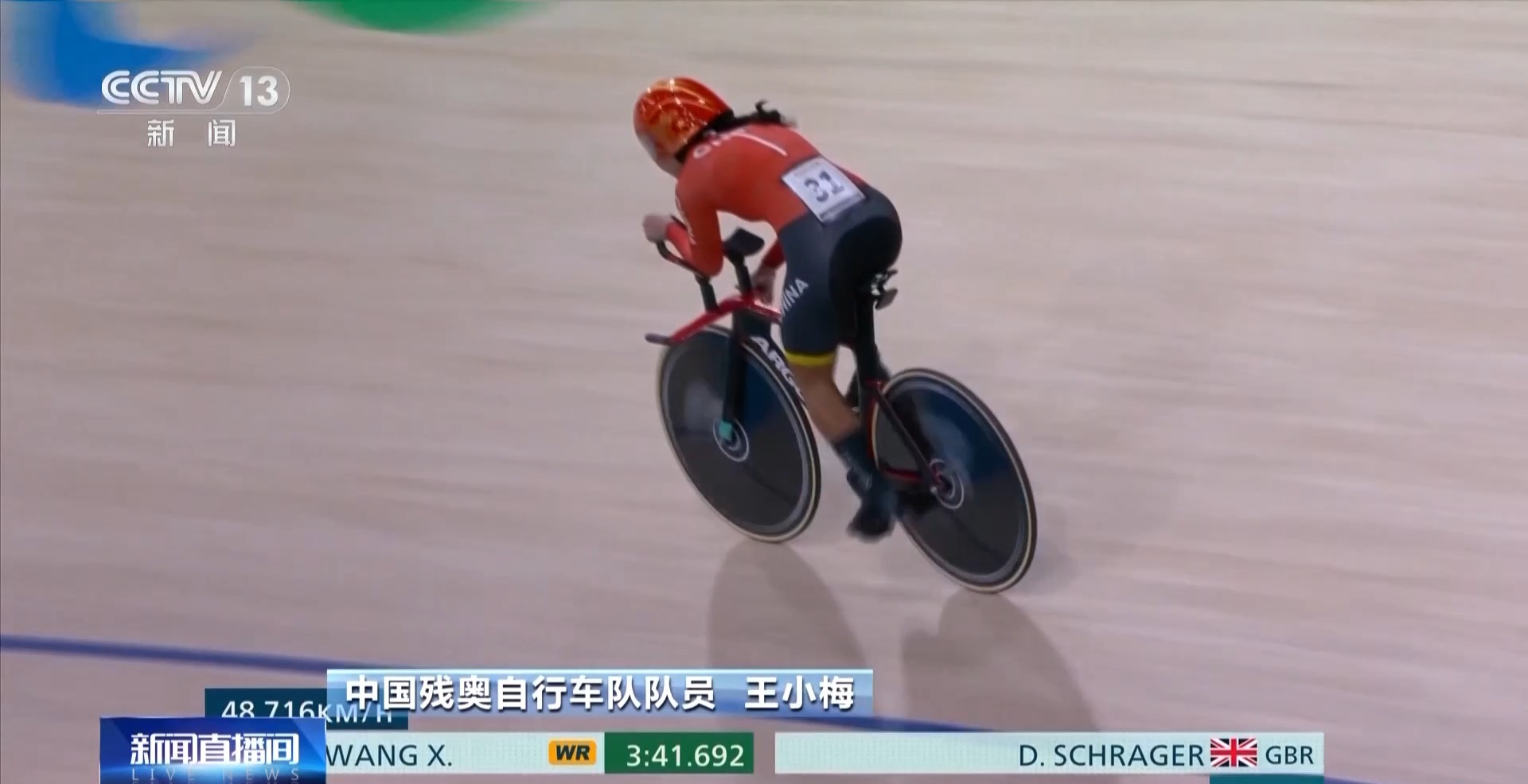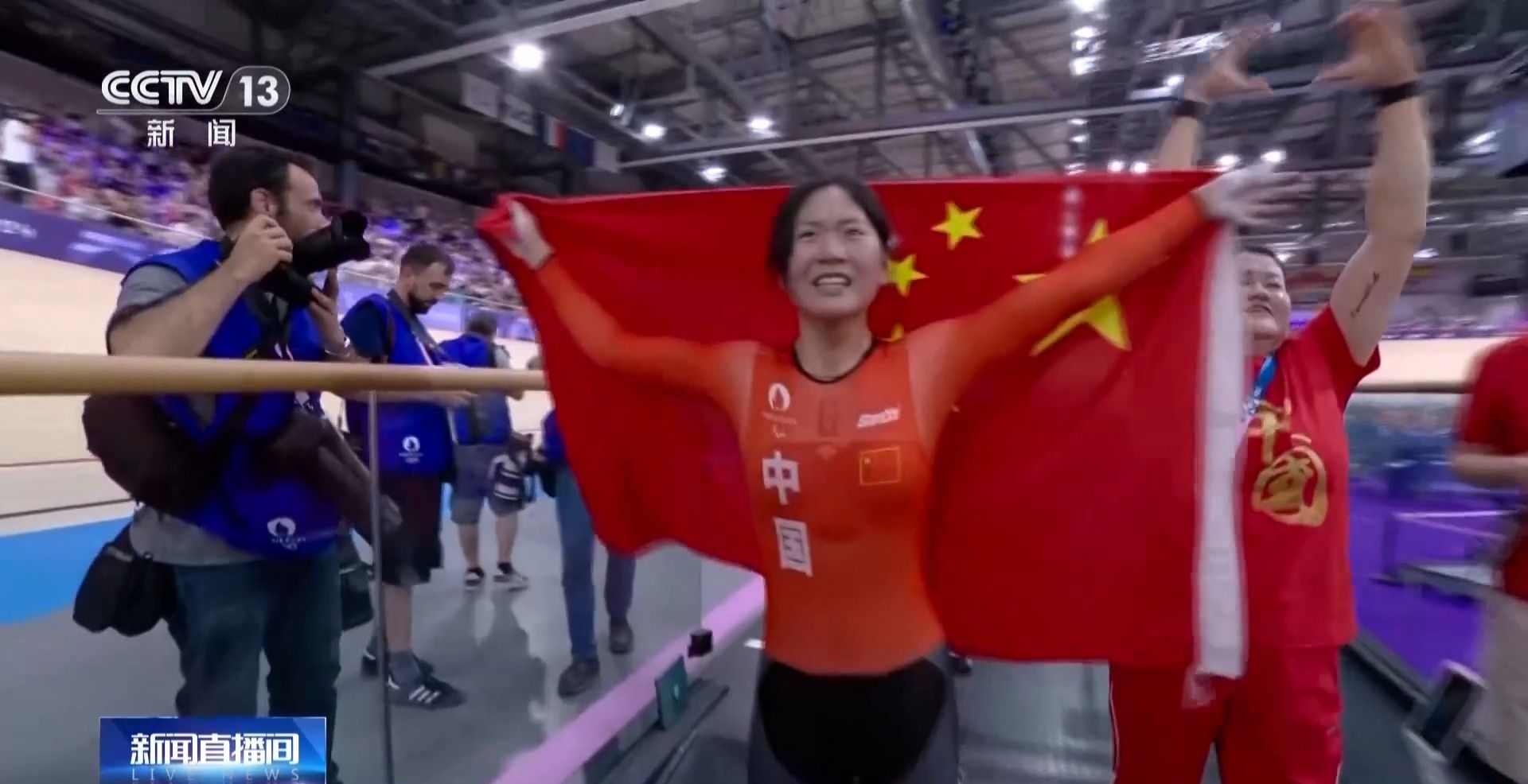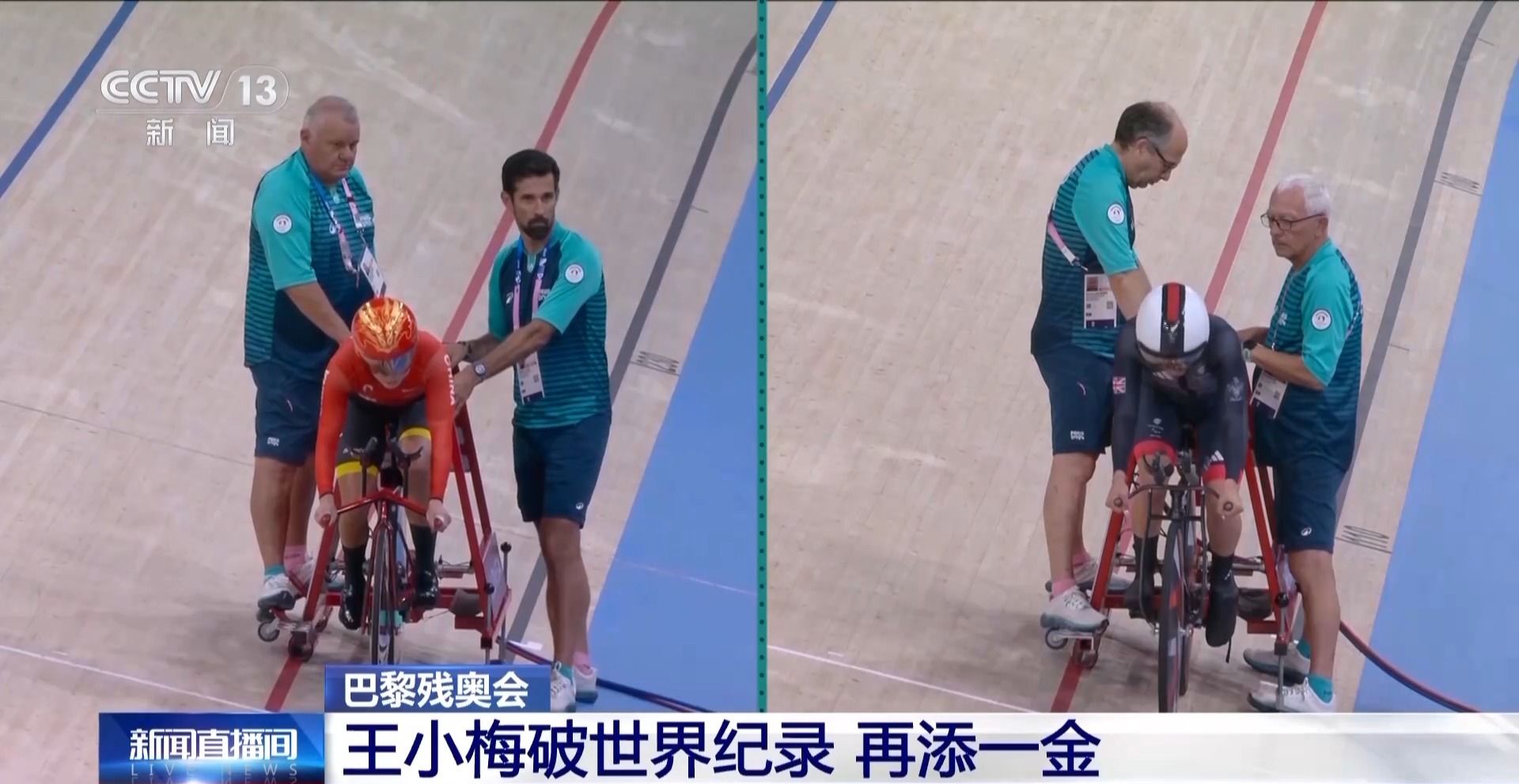 中国残奥自行车队队员 王小梅:赛场上的氛围太好了,那么多人在赛场上给我加油、呐喊,我就想我一定要顶住,一定可以的。我一直奋力追她,最后比赛结束了都不知道,我以为还有一圈。在关键的时刻,我顶住了。