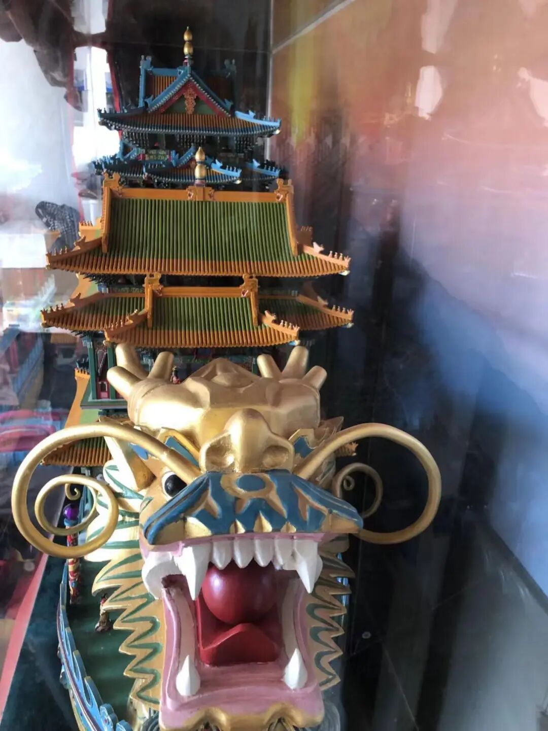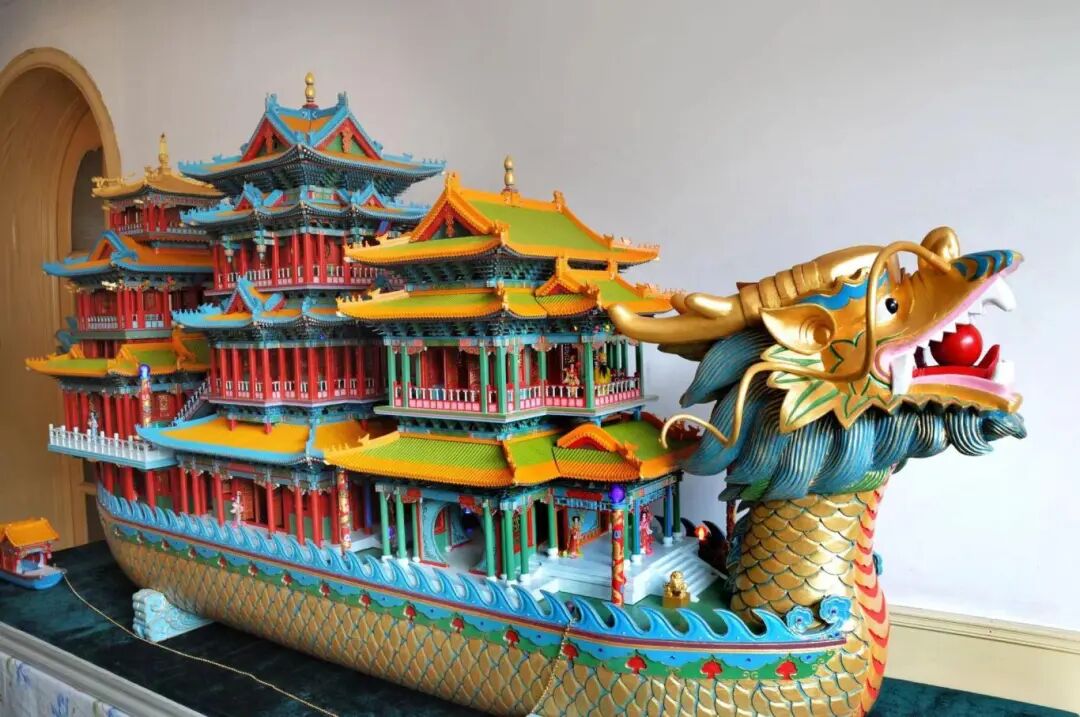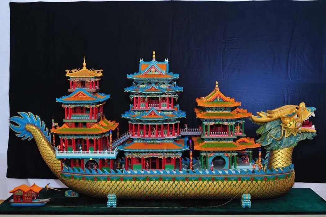 龙舟木雕模型长达2米,装有3座仿古建筑楼阁,内含斗拱18366件,还有彩绘金龙1168条,以及有柱子、活动门窗、垂兽、盏等组件,共用木件两万五千多件。全部木件均以精巧的中国传统建筑结构——榫卯结构所搭建,整个龙舟重达200斤,制作过程繁琐。
