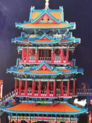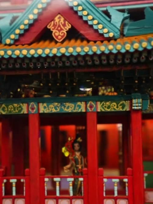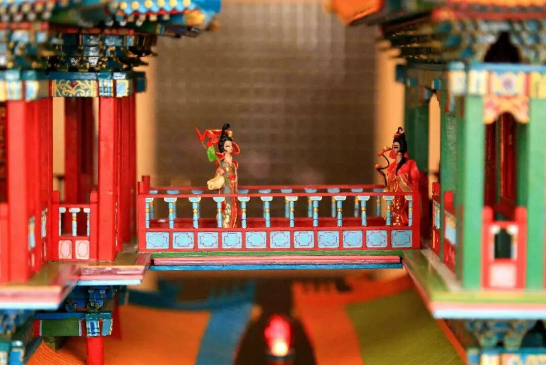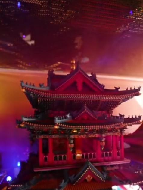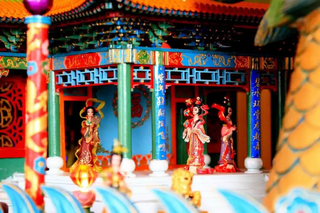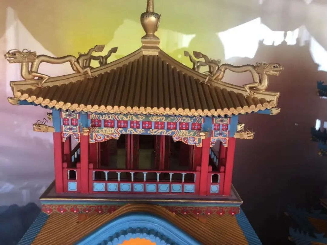 “廊腰缦回,檐牙高啄;各抱地势,勾心斗角。”几千年来,中国文化尤其是中国古建筑耀目光彩不褪,底蕴传承至今。基于对中国古建筑的喜爱,孙志芳在龙舟之上设计了三座精美的古建筑。从龙头端向龙尾数起,第一座模型仿造山西榆次城隍庙玄鉴楼的二层三重檐歇山顶式建筑——春晖阁。第二座则是仿山西万荣东岳庙飞云楼十字歇山顶三层四重檐组合式建筑——飞云楼。最后一座仿了北京故宫雨华阁四角攒尖三层三重檐组合式建筑——雨华阁。